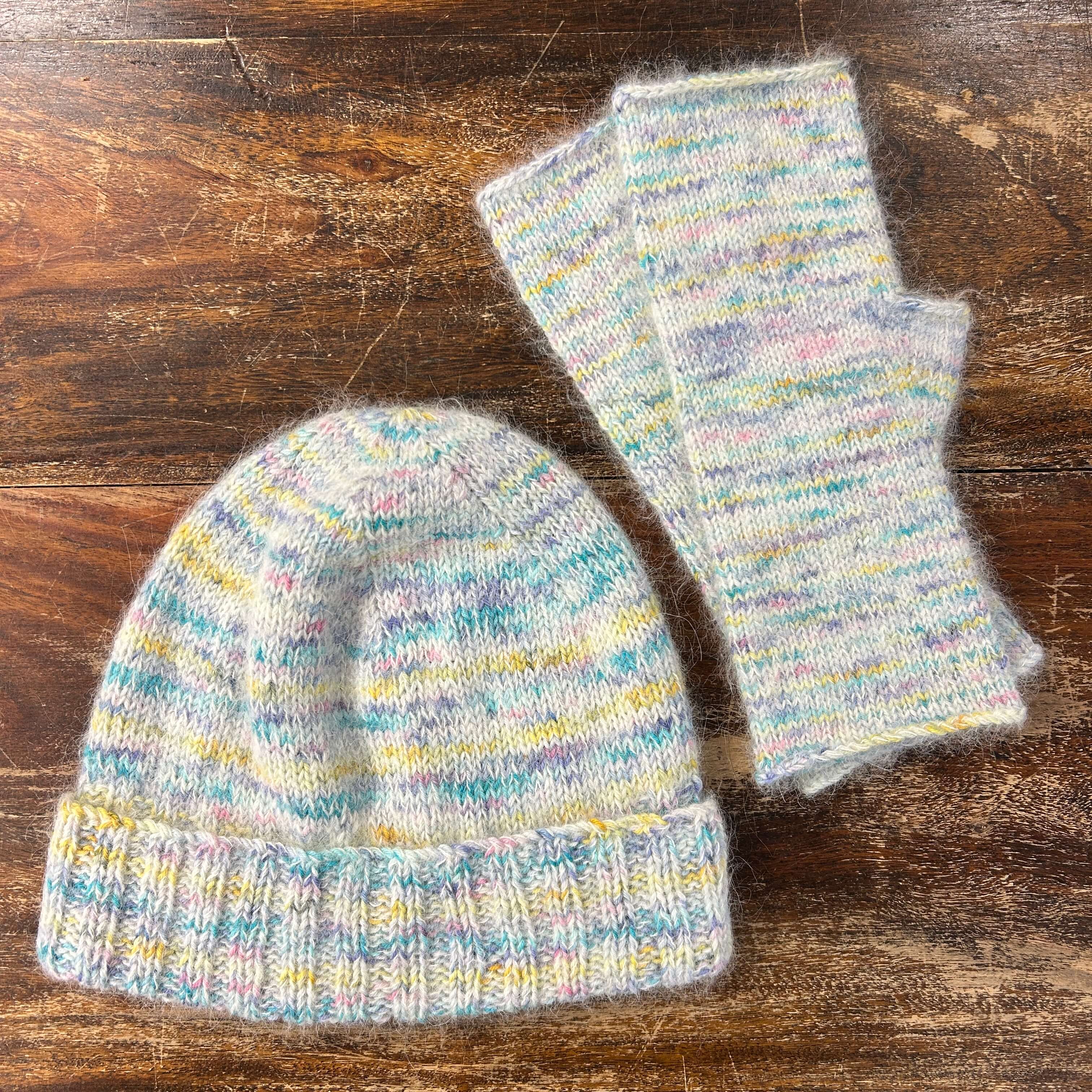Because our Pom Pom Tree yarn comes in 100g skeins with 425m. And the Cloud 800 is a 50g skein with 400m we were left with a lot of yarn... which Sue turned into a pair of matching fingerless mitts (using our free Simple DK Mitts knitting pattern ).