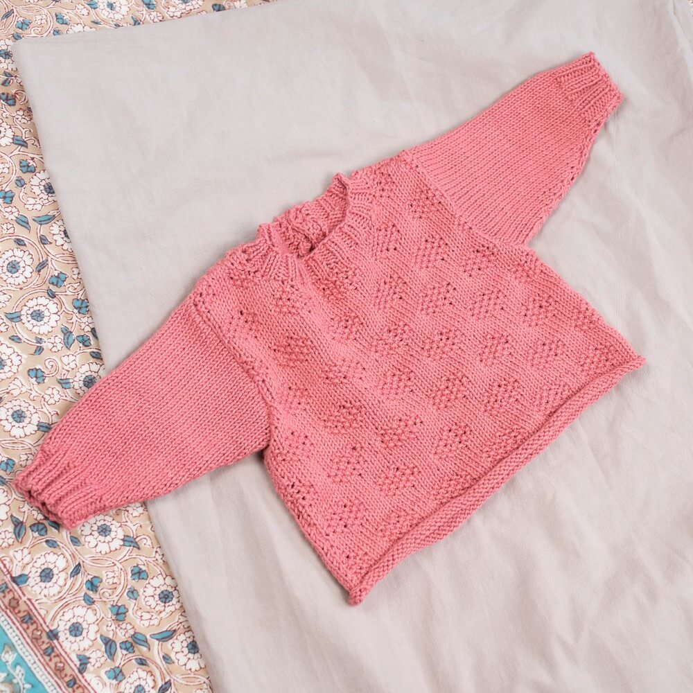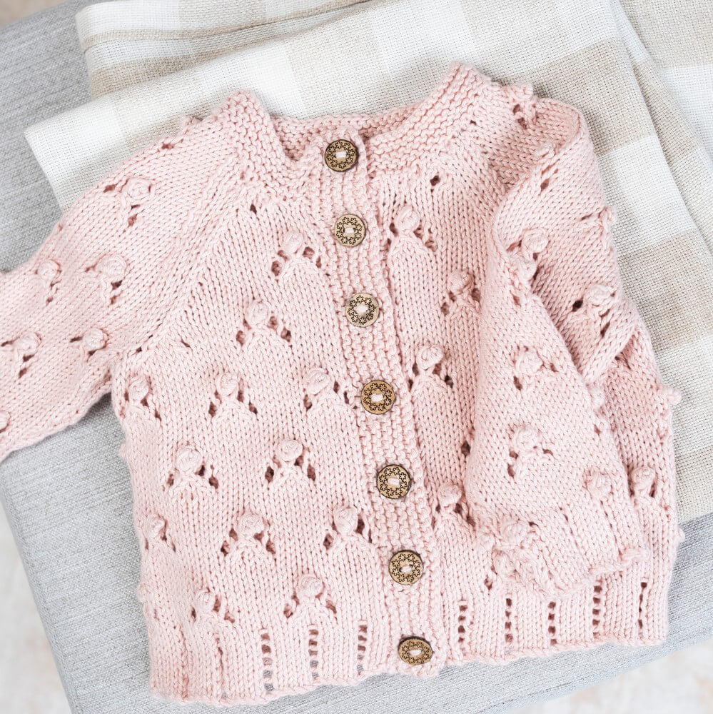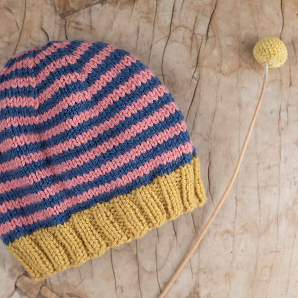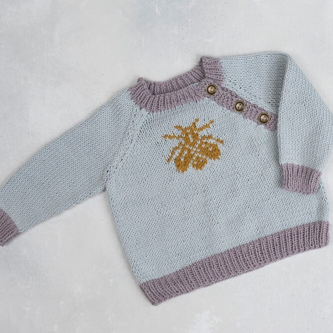Designs include a busy bee logo sweater, simple lace textures and striking stripe hat. And two throw on cardigans for adults.
