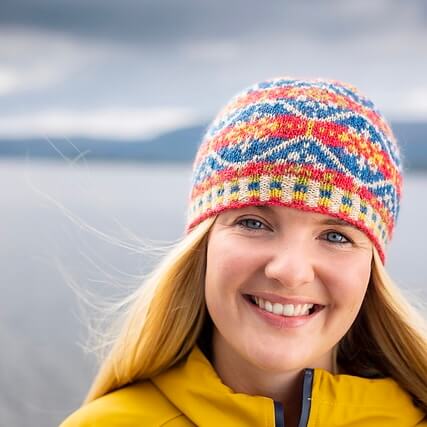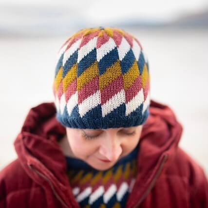 In Starnkeeker, the familiar monochrome motifs of Selbu accessories are adapted for a colour- blocked Argyle vest.
