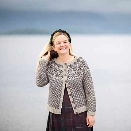 The Tìoraidh cardigan reveals how a small “filler” motif might become a two tone pattern’s main attraction.