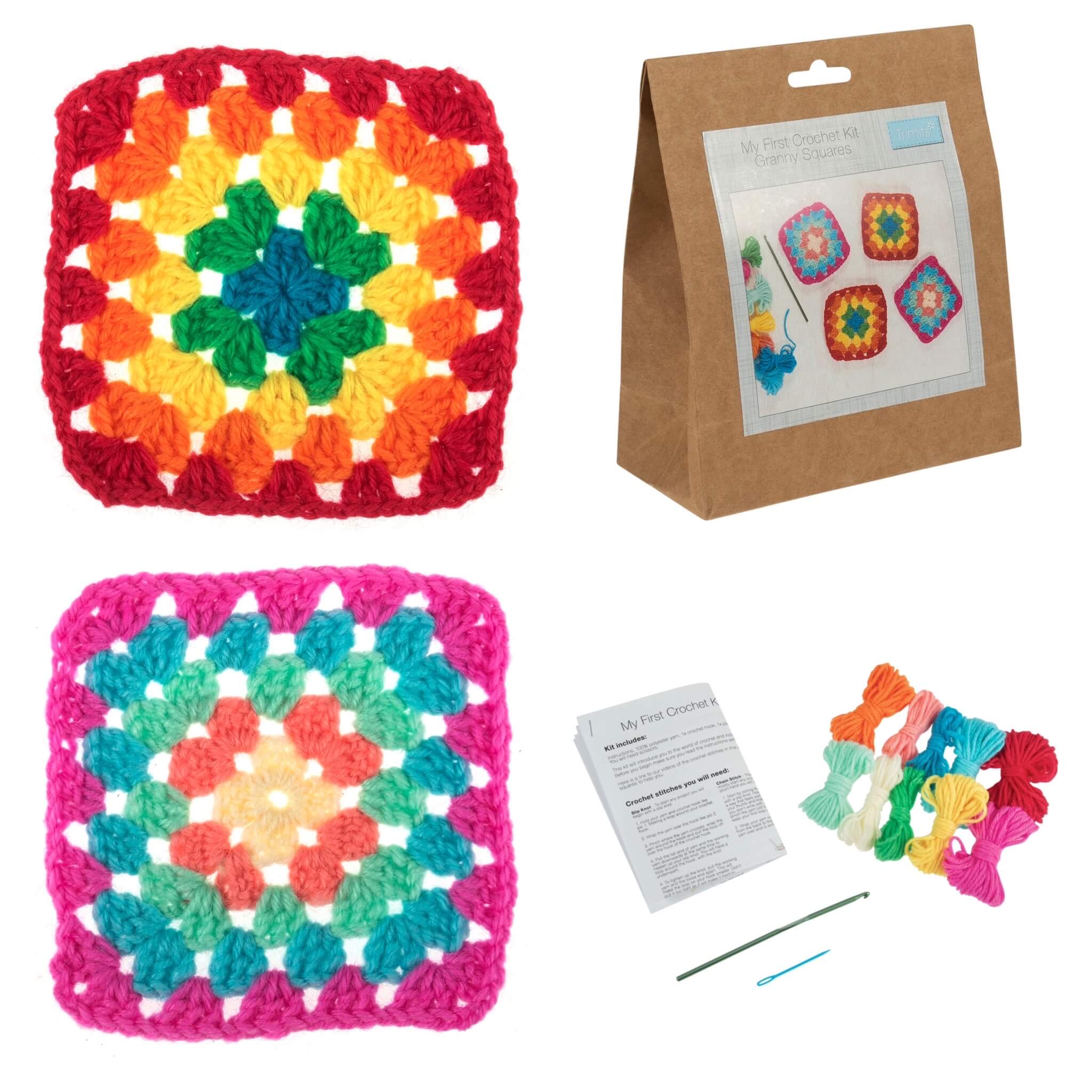 My First Crochet Kit 1- makes 4 crochet squares. Includes: polyester yarn; crochet hook and instructions. Each finished crochet square measures approximately: (w/h) 11 x 11cm..