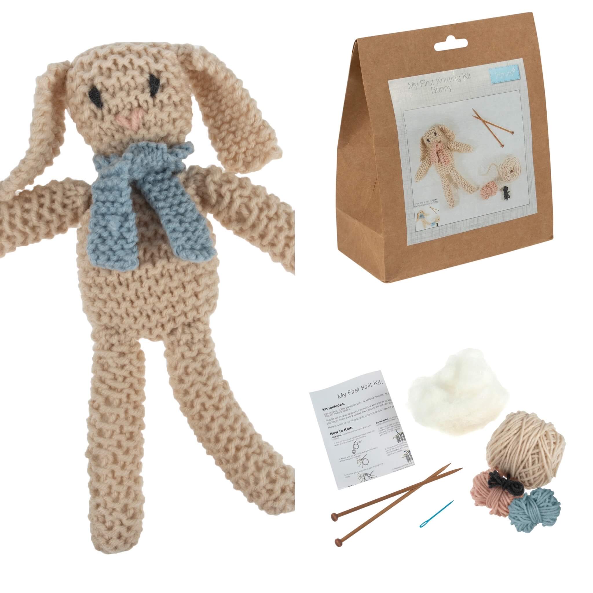 My First Knitting Kit - makes a knitted bunny and scarf, Includes: polyester yarn; knitting needles and instructions. Approximate finished size: (w/h) 18.5 x 27.5cm