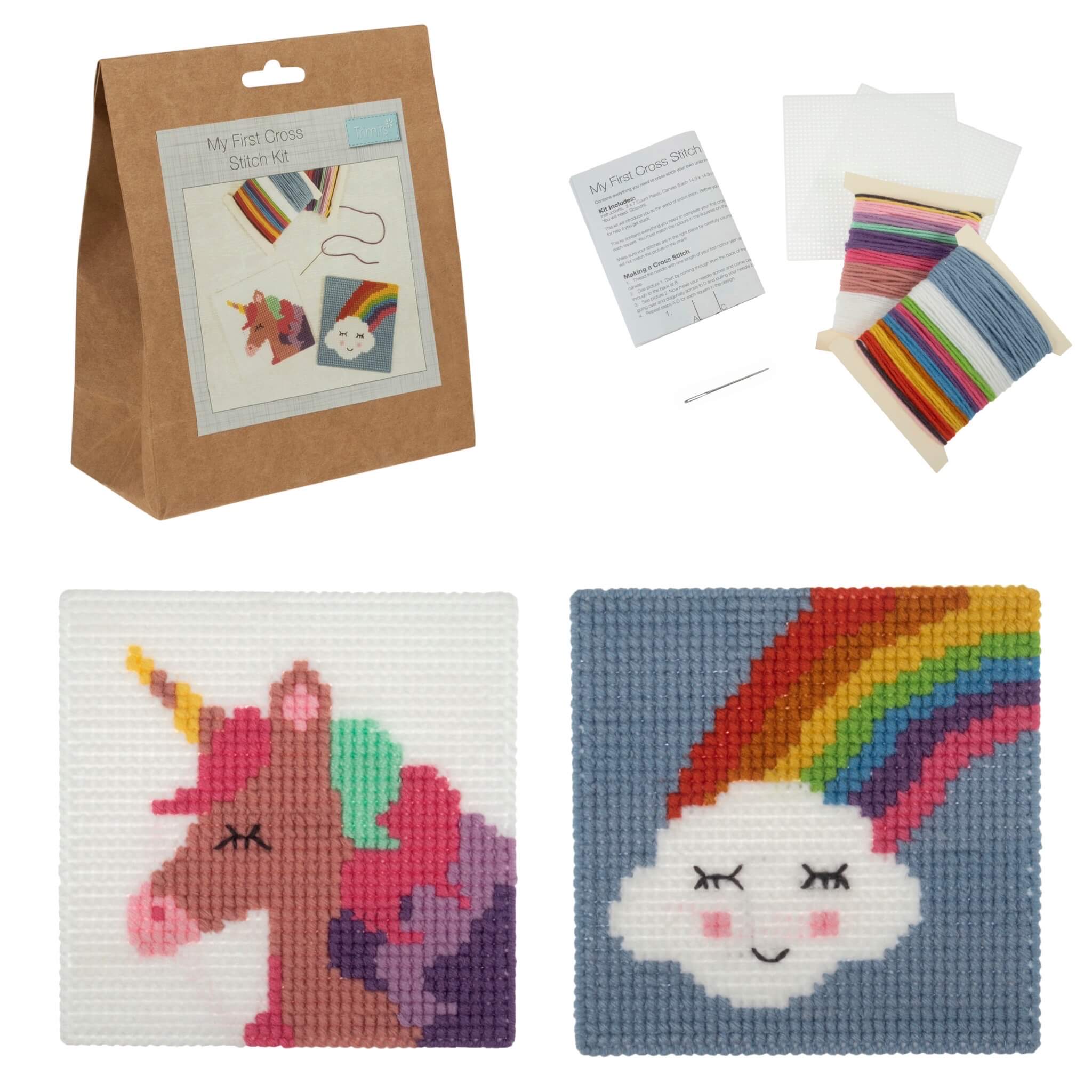 My First Cross Stitch Kit - includes: 2 sheets of 7 count, plastic canvas measuring (w/h) 14.3 x 14.3cm; 2 x metal needles; acrylic yarns and instructions. Approximate finished size: (w/h) 14.3 x 14.3cm