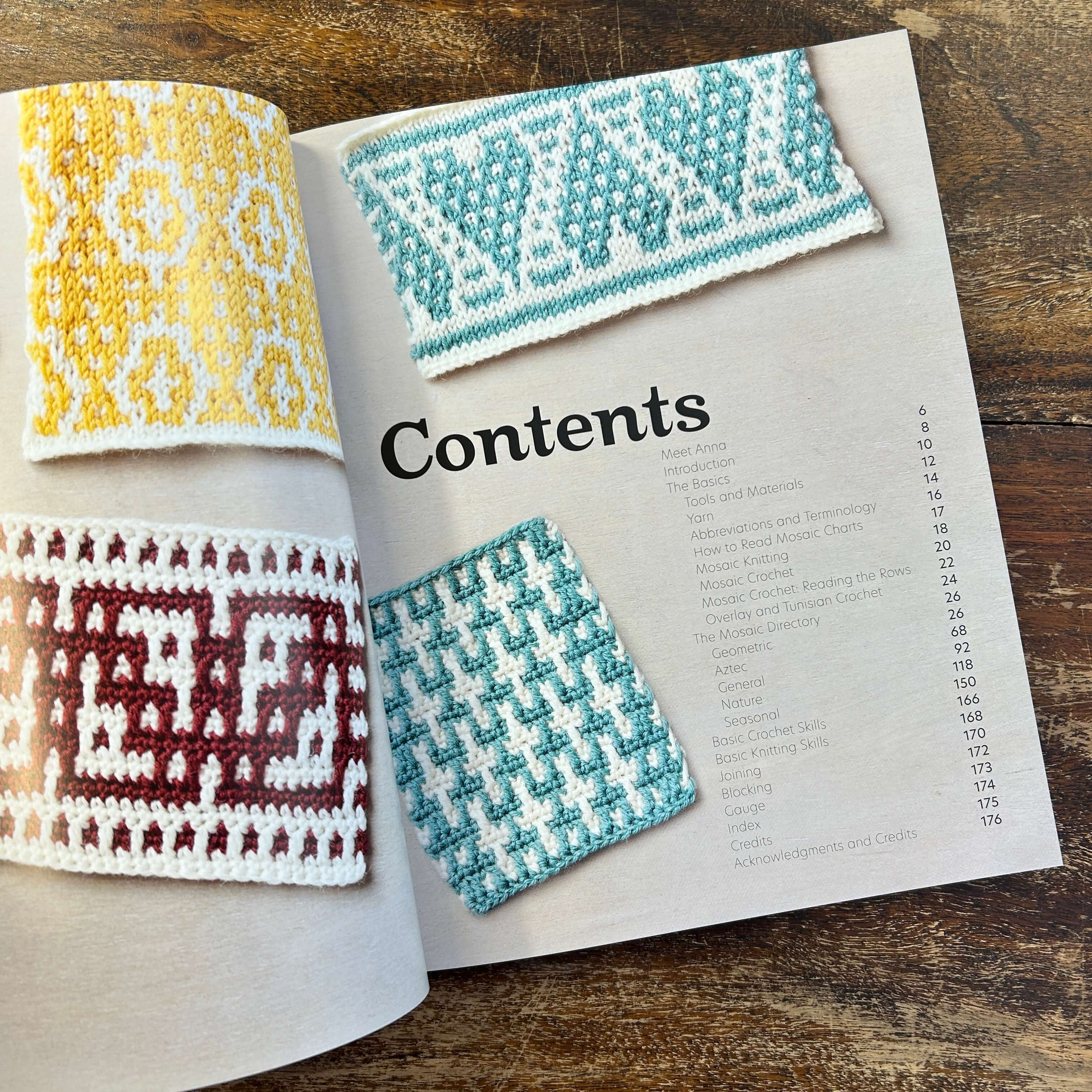 Every design starts with an introduction followed by a guide on how to mosaic knit and crochet it with colourwork charts and photography showing both knit and crochet samples. Each pattern has an ability grading (in hooks and needles) and they vary in complexity from very simple designs through to much more complex chevron and diamond patterns.