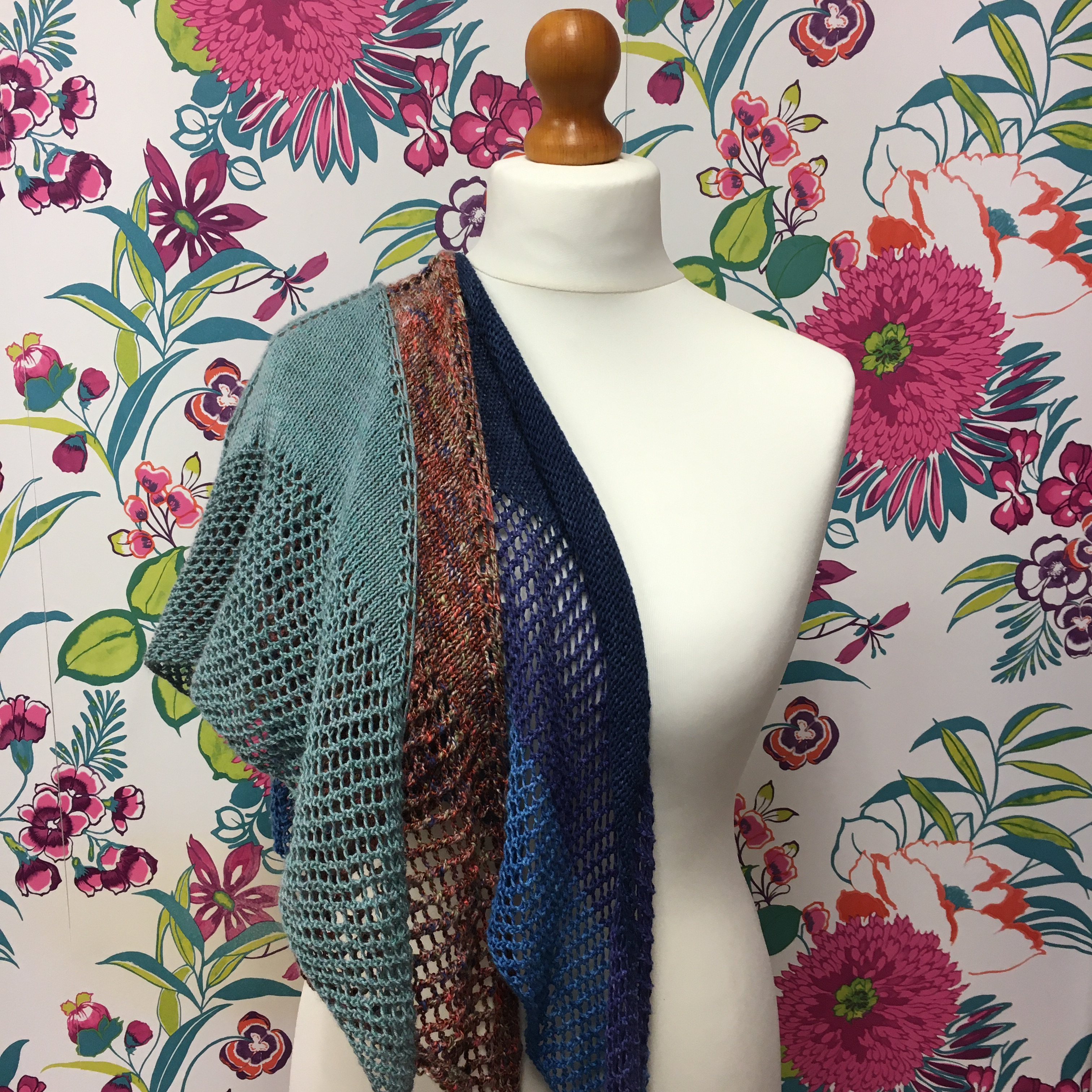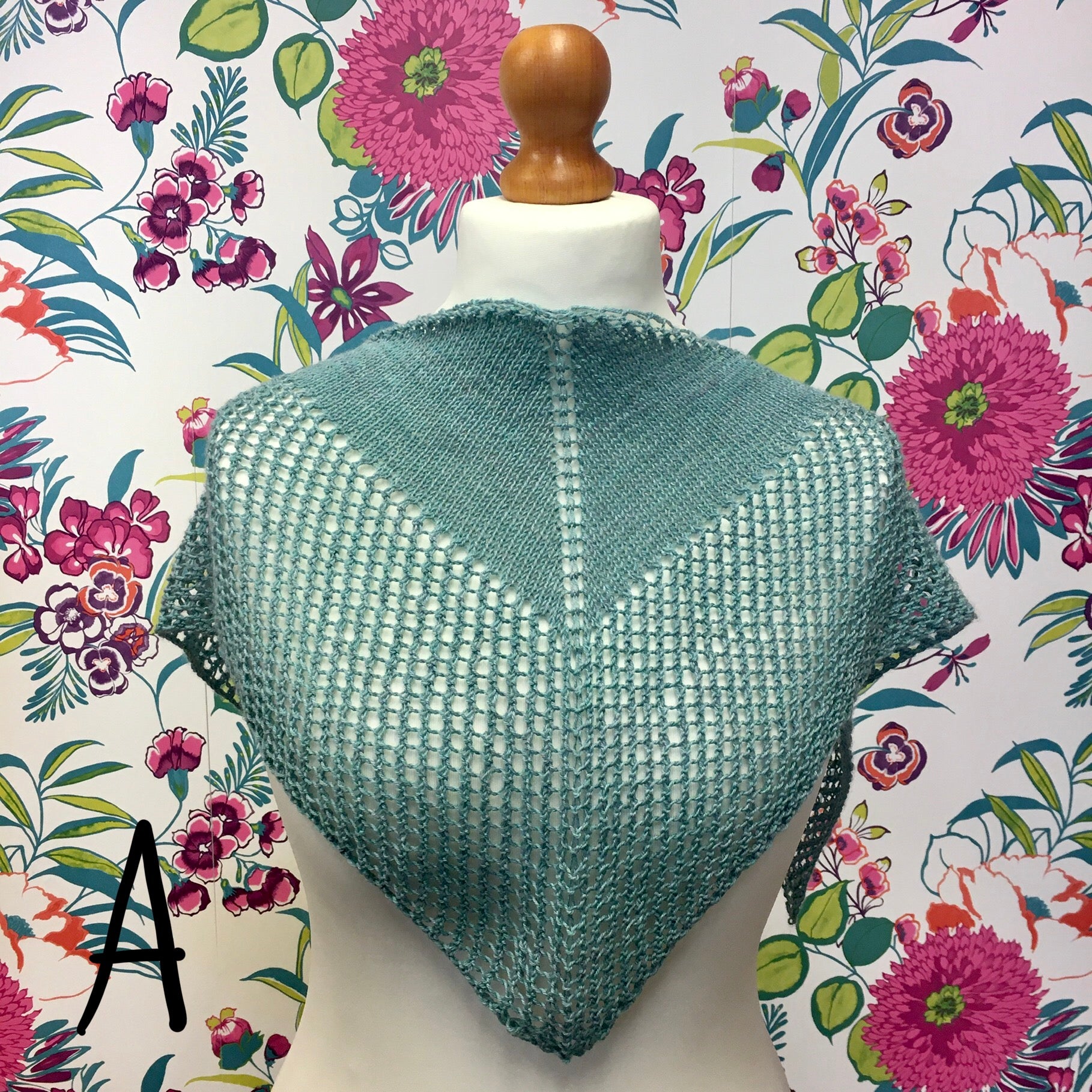 Shawl A - The 4ply small shawl uses a 4mm circular needle and approximately 210m of a 4ply yarn. We used a 50g hank of Socks Yeah 4ply for our shawl, in shade 108. It measures – 115cm wide and 35cm deep.