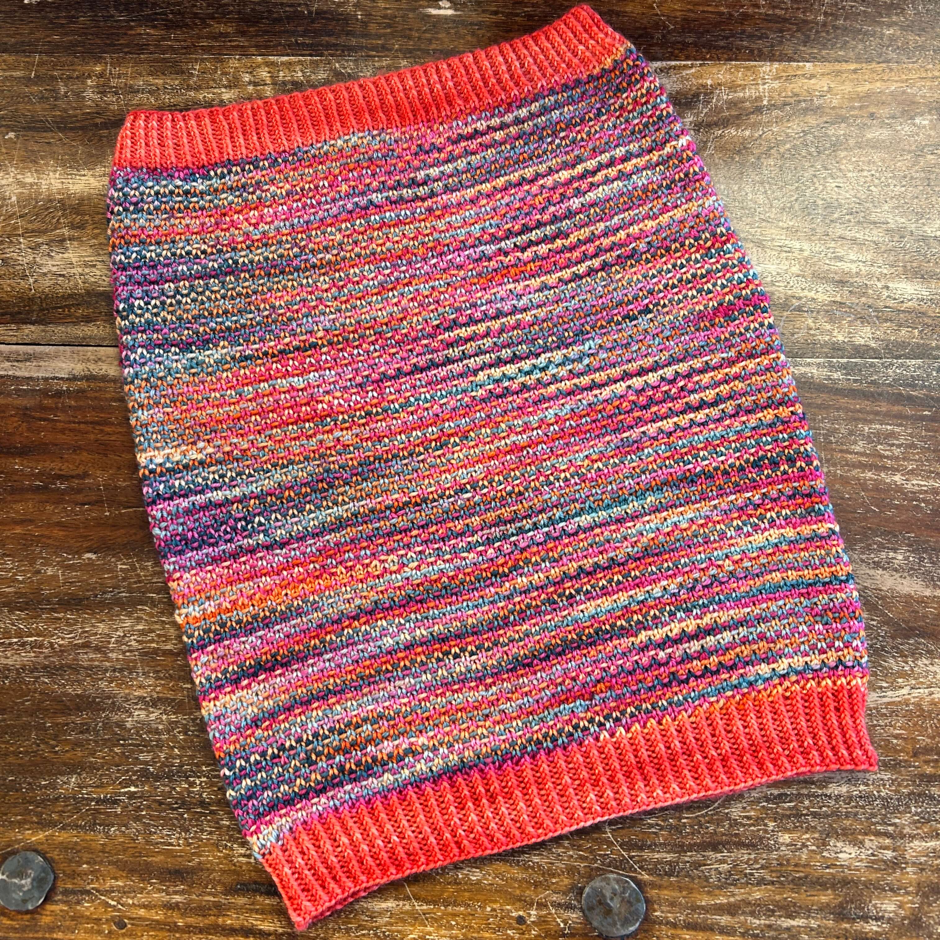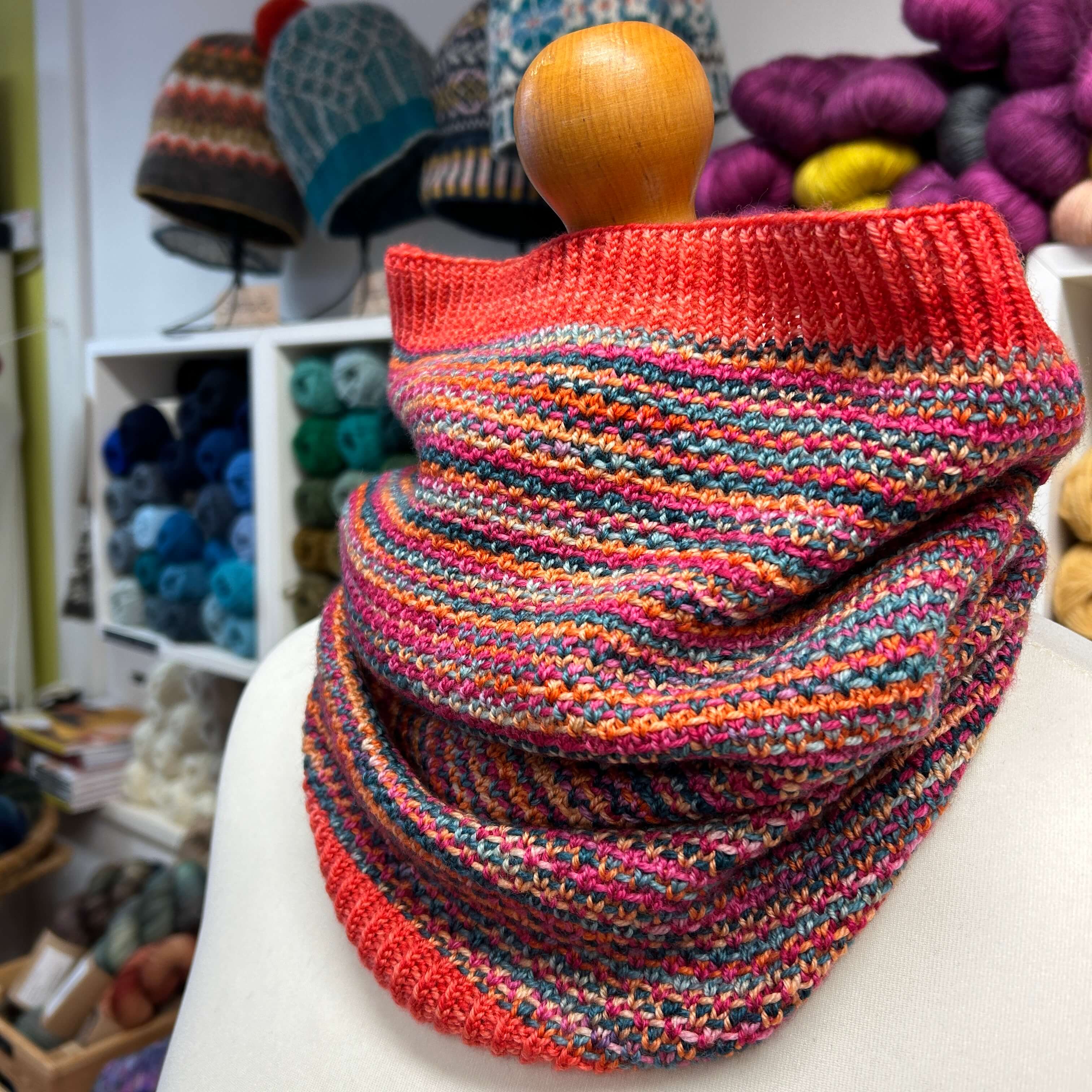 Knitted on a circular needle this cowl uses simple slip stitches to create a woven look. It looks great with both highly variegated or semi solid yarns and adds an interesting texture to single colours. Read more about this Half Linen Stitch Cowl in our sample gallery here.