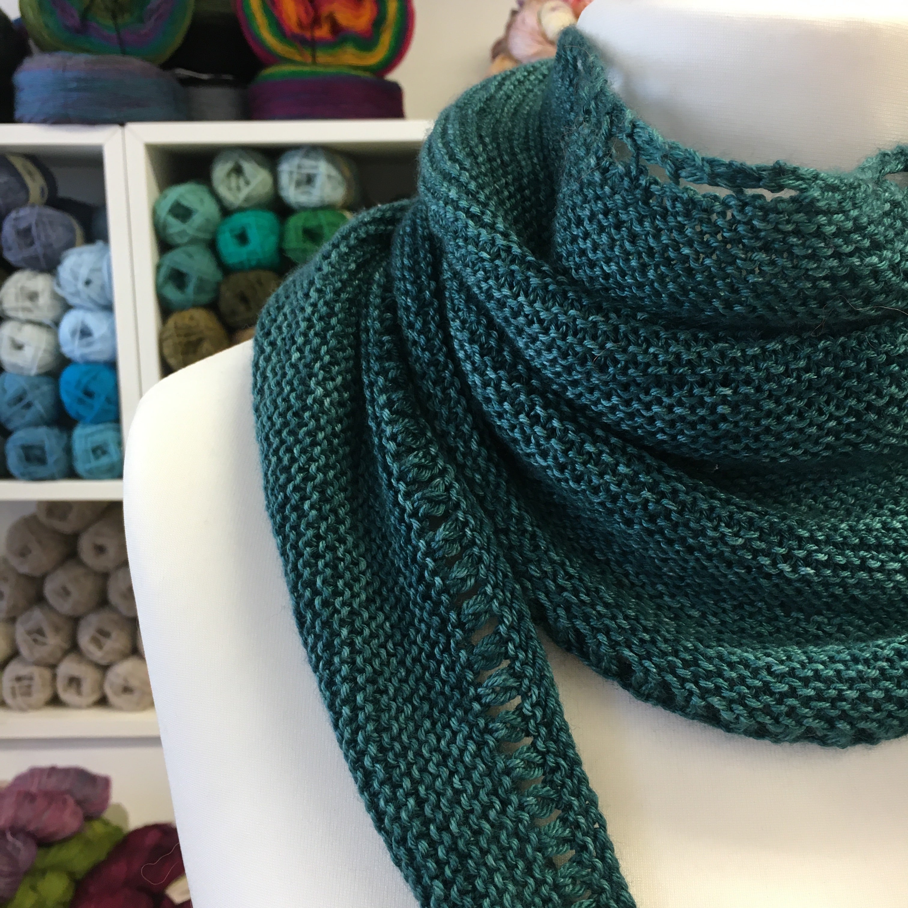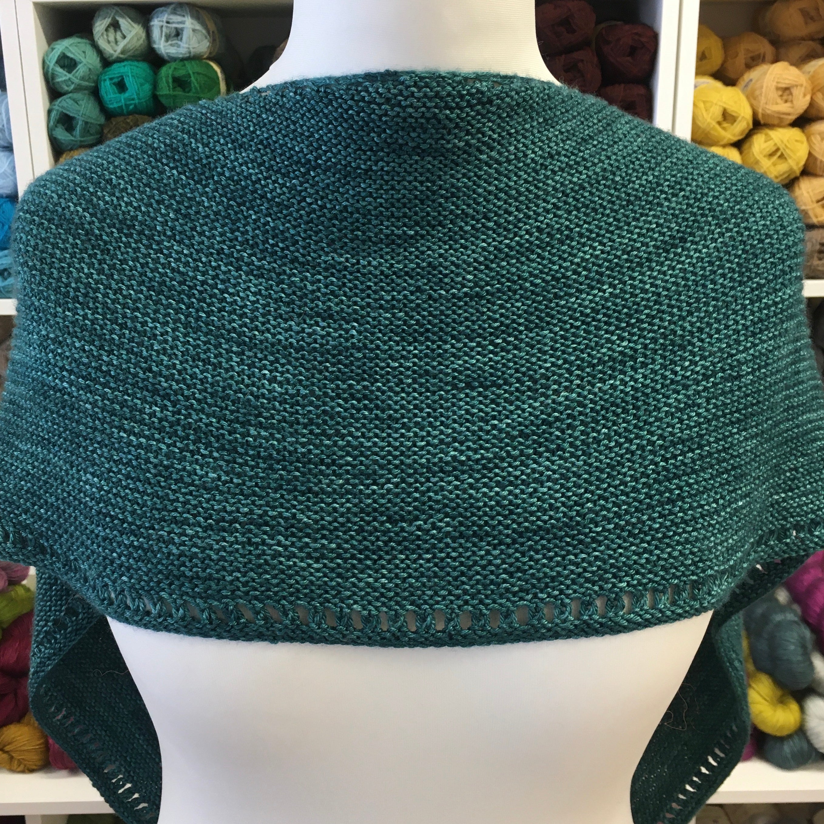 If you like the shape of this shawl, check out our other free shop patterns Alpaca Scarf and Simple Gleem Shawl. Both have a similar shape and use the same method of increasing, but they have a stocking stitch body.