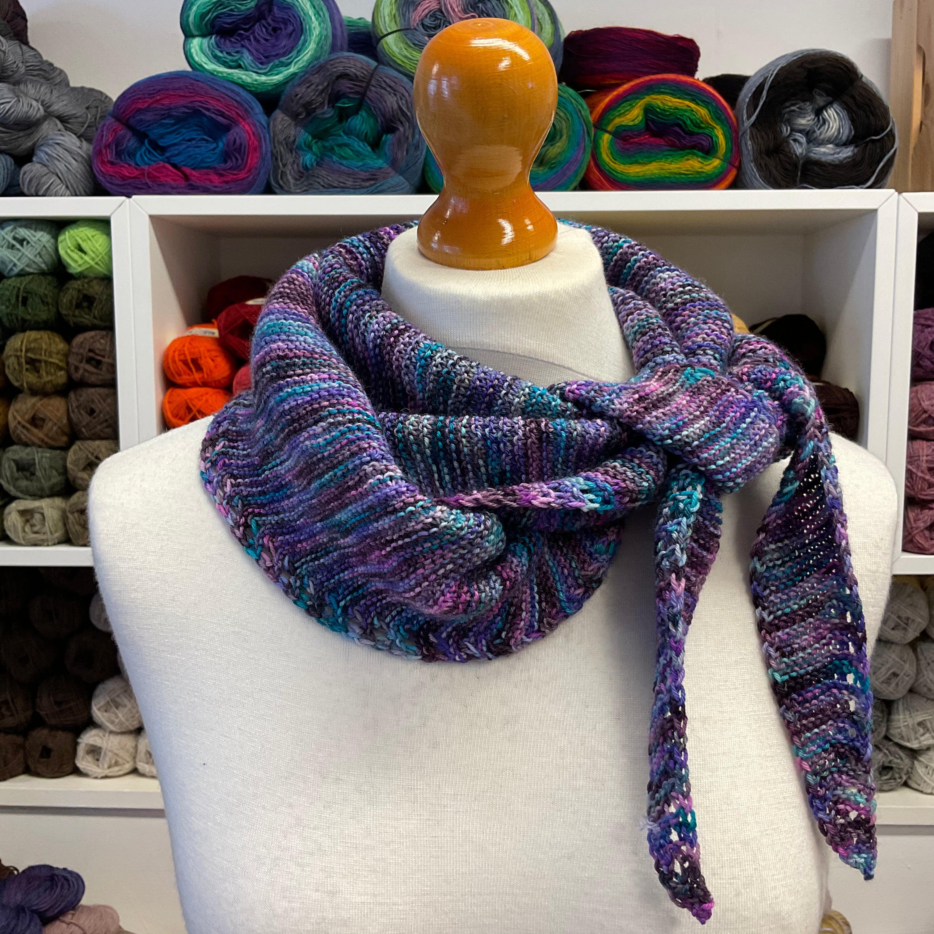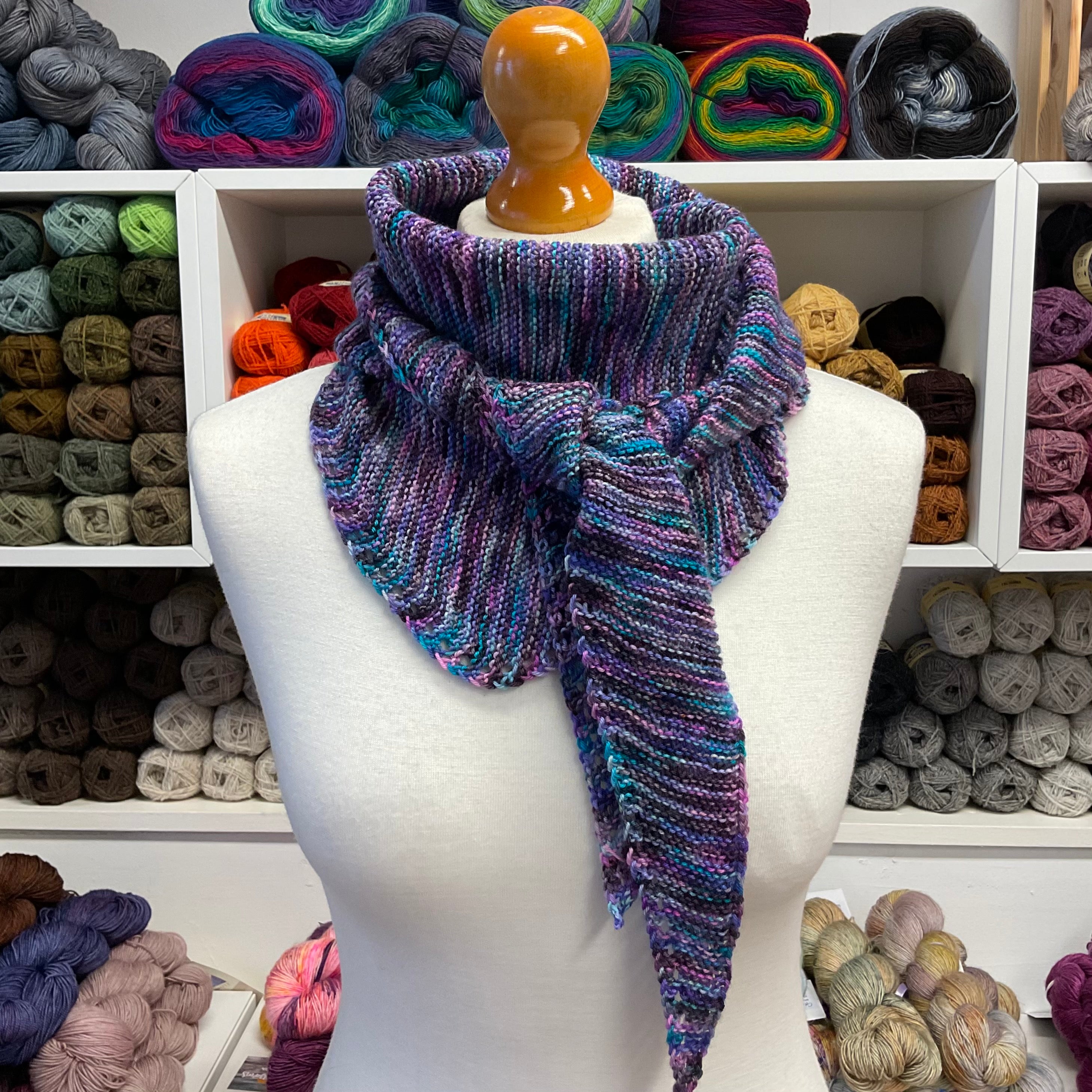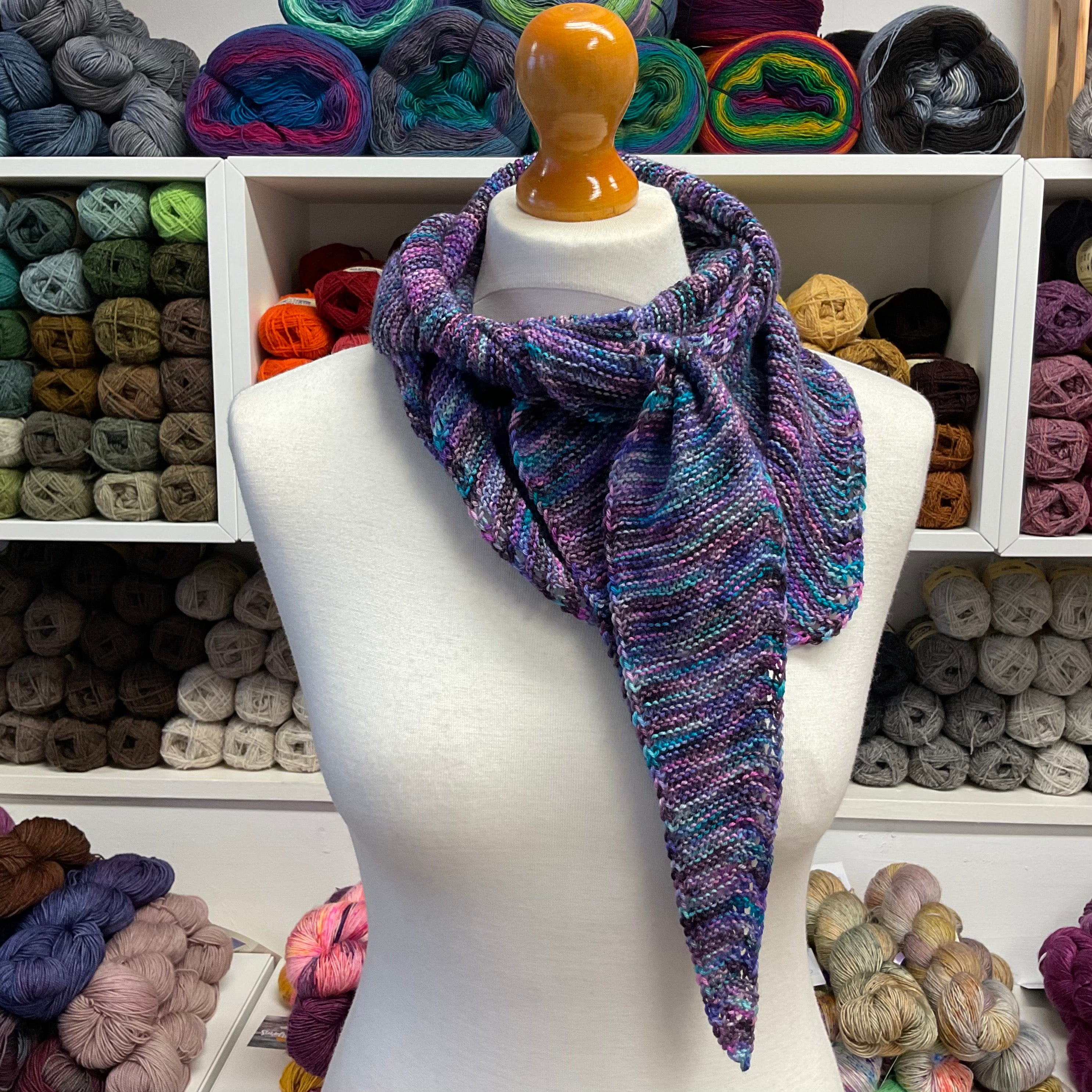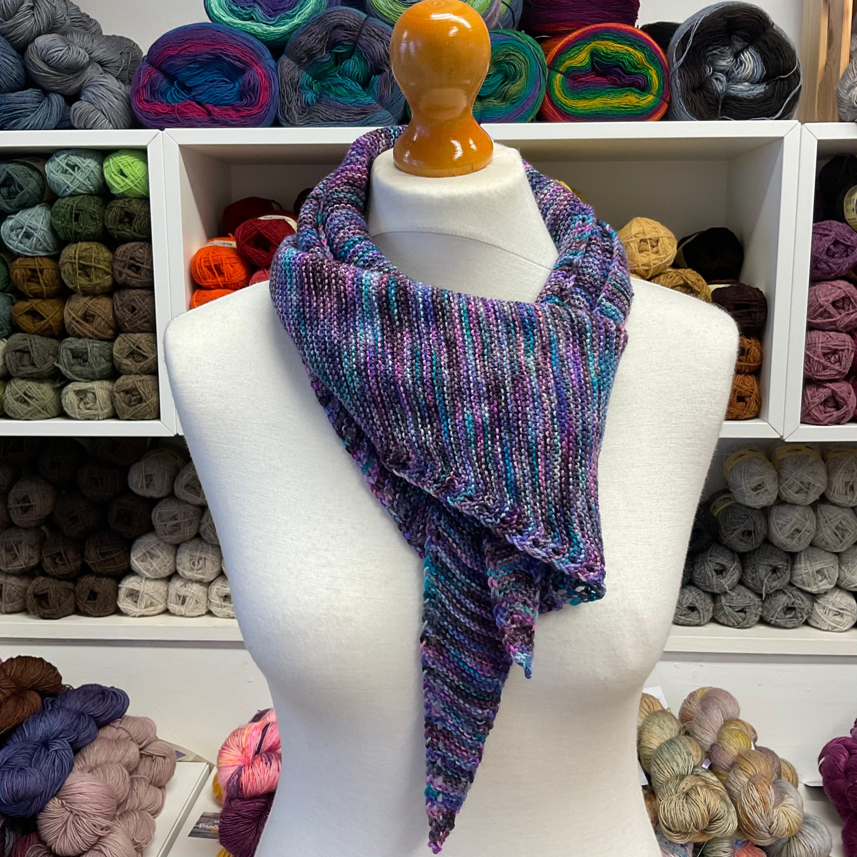 Free digital Woolly Brew knitting pattern for a simple side-to-side shawl in 4ply yarn.
