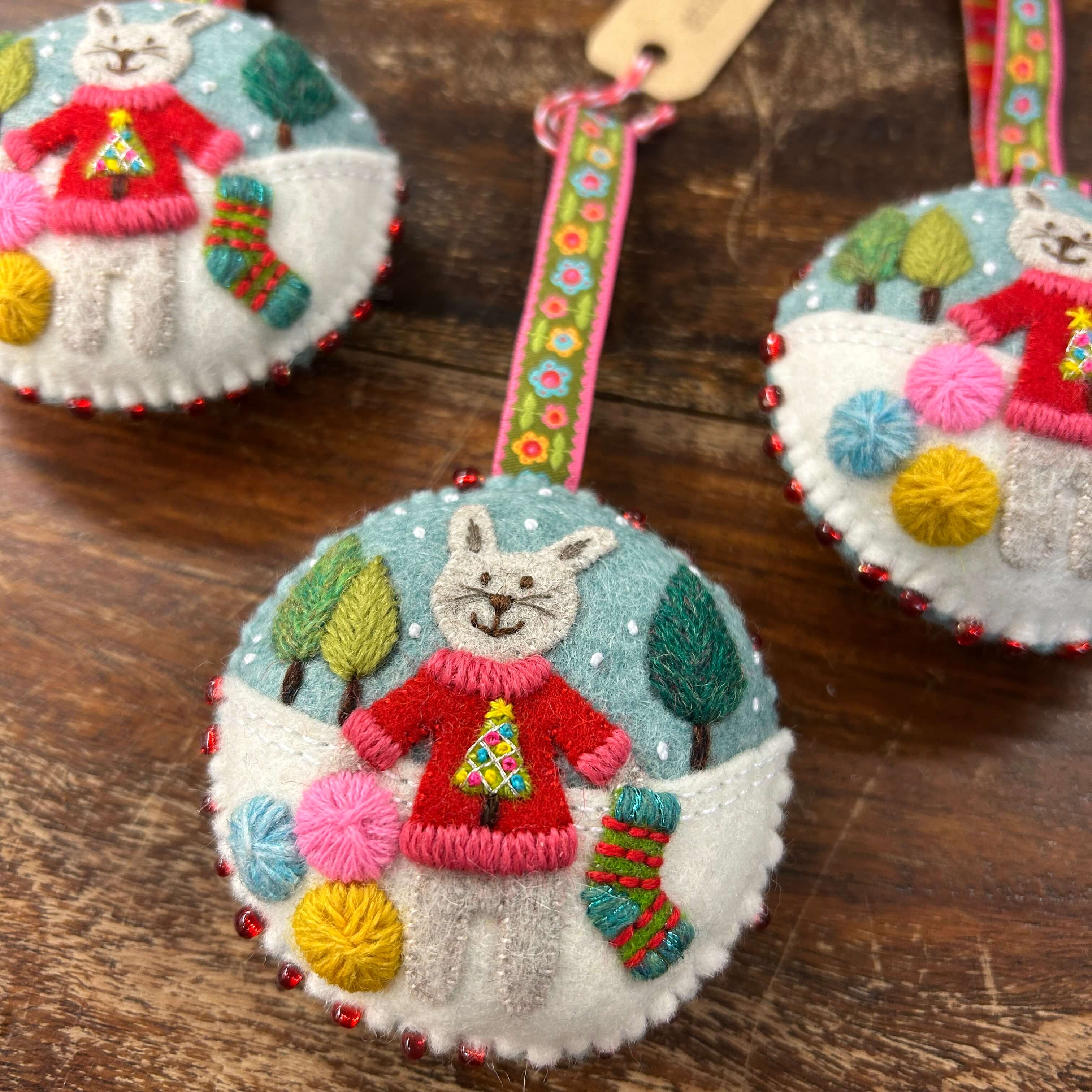 Each bauble is designed and hand stitched by Lorna in Orkney and feature her rabbit and fox characters in cute Christmas jumpers.