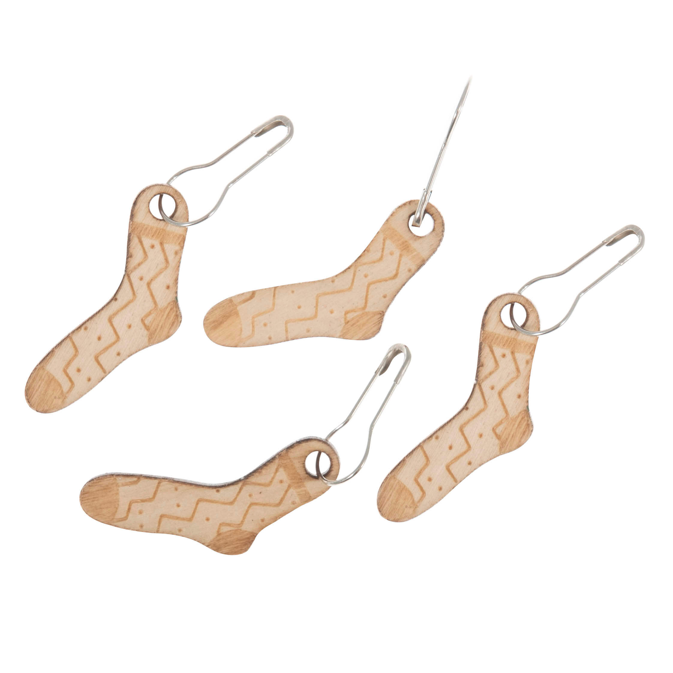 Sets of cute laser engraved wooden stitch markers on bulb pins.
