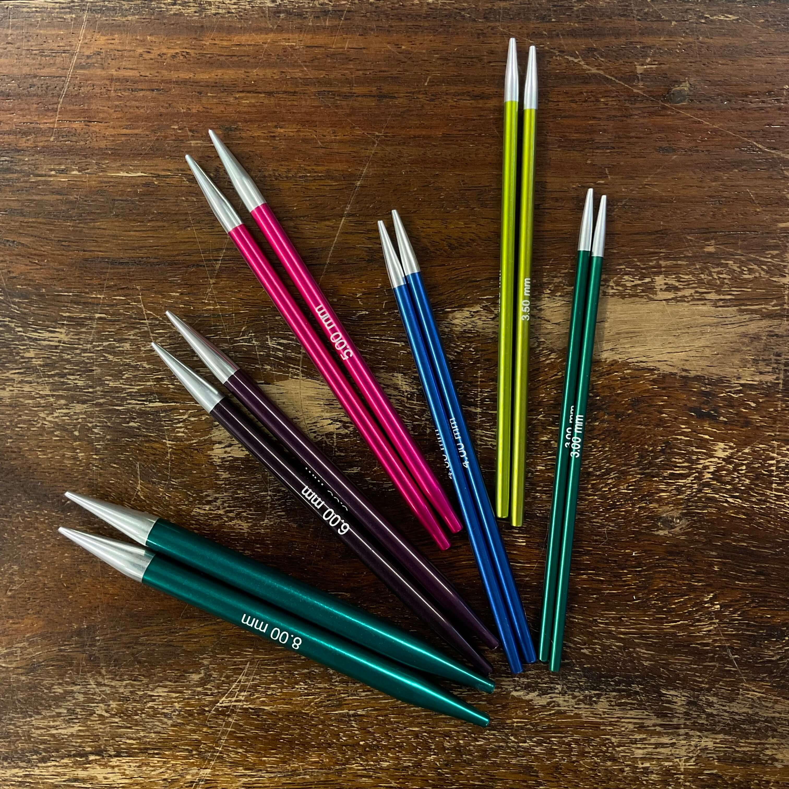Zing needles are brightly coloured aluminium with silver tips. The metallic shades are specific to different sizes so it's easy to see what sizes you have. These metal needles are slippier than wood and the tips are little bit sharper. Great for sticky yarns and lace work.