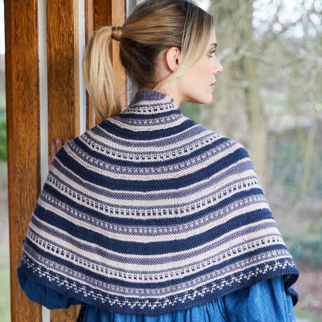 Free digital knitting pattern by Sarah Hatton, Grete is a semi-circle shawl using stripes and stranded colourwork. Pattern uses wrap and turn short rows. All instructions are written.