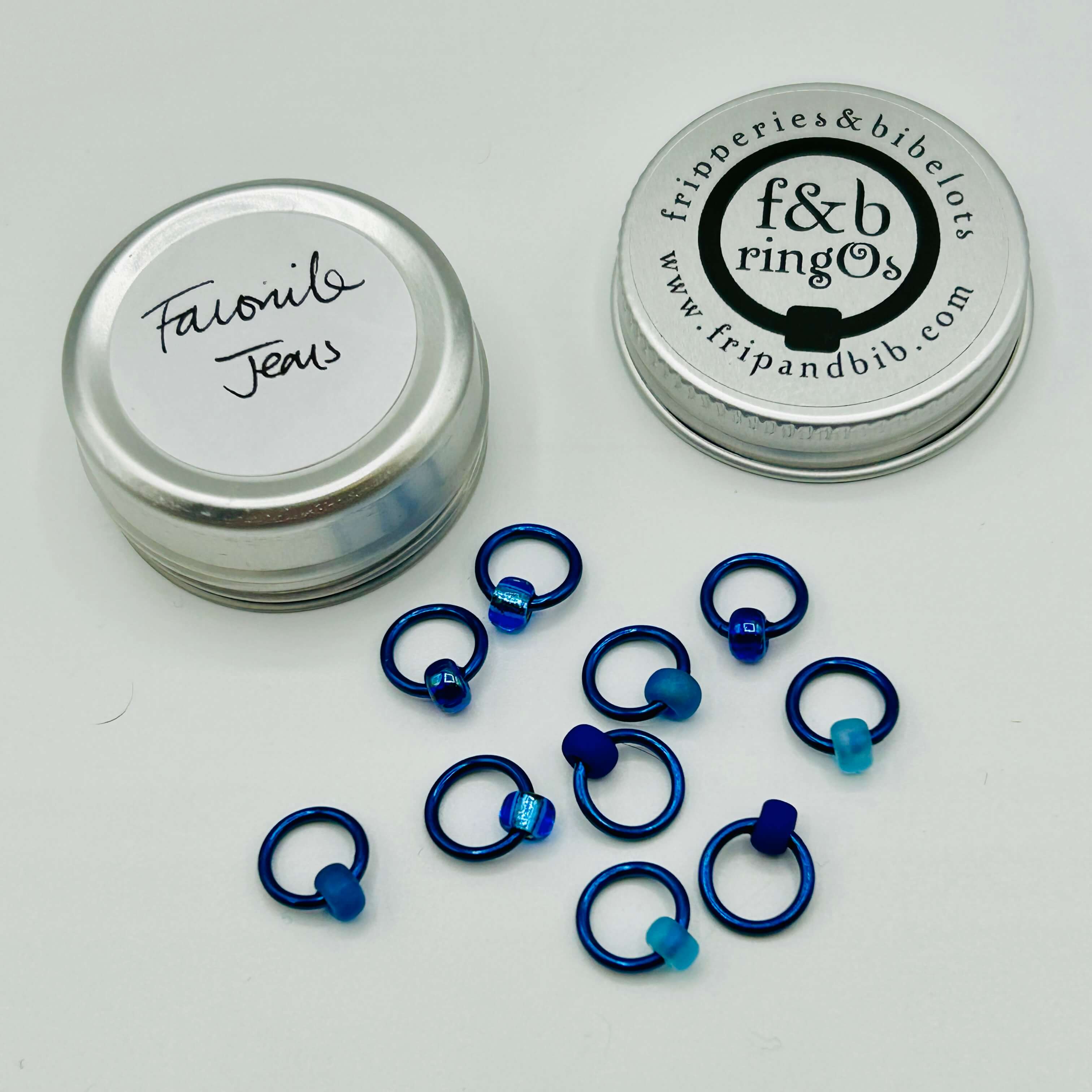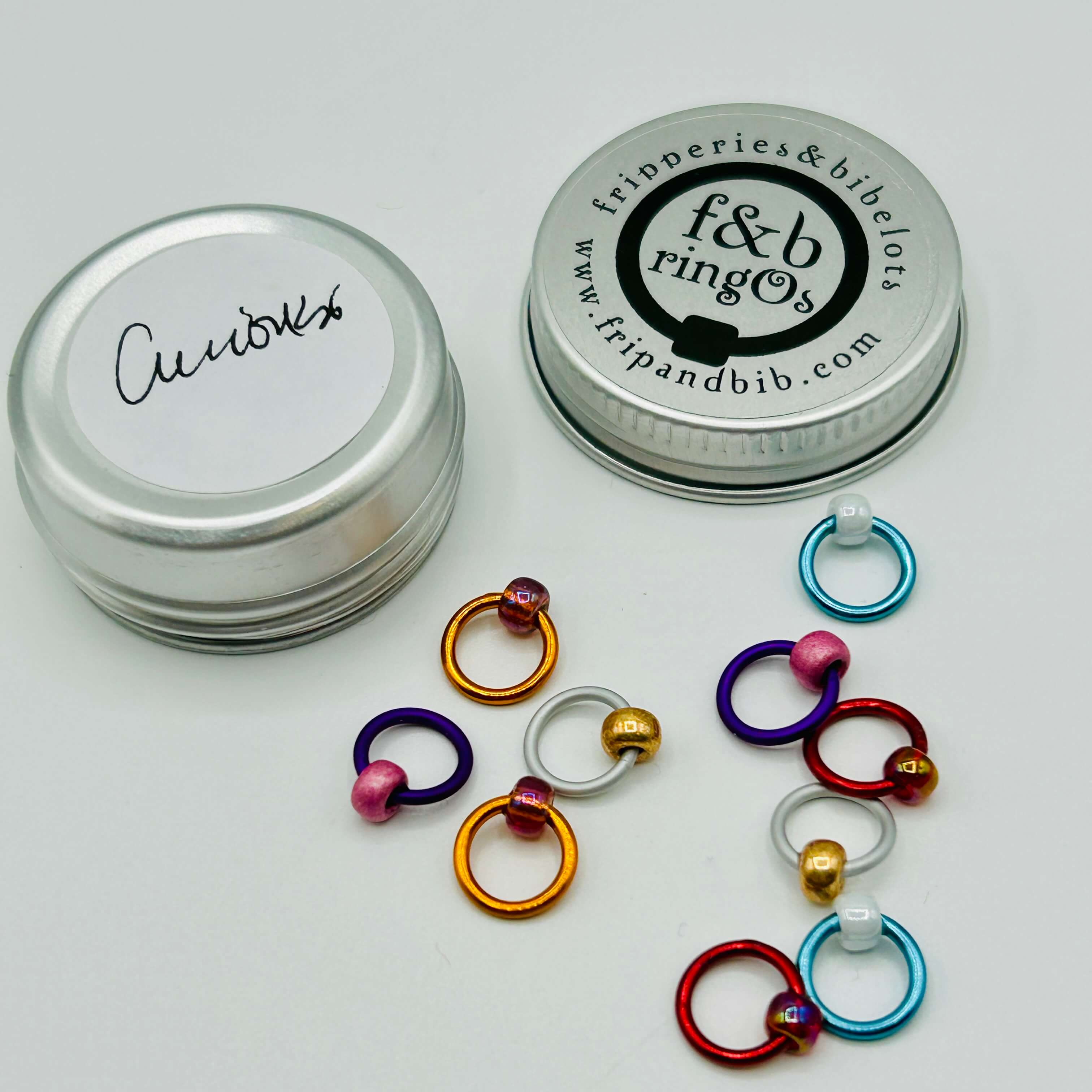 These colourful markers are handmade and come in delightful colour combos. Each set has 10 rings and come in their own tin. They fit needles up to 4mm. For larger needle sizes, check out RingsOs XL.