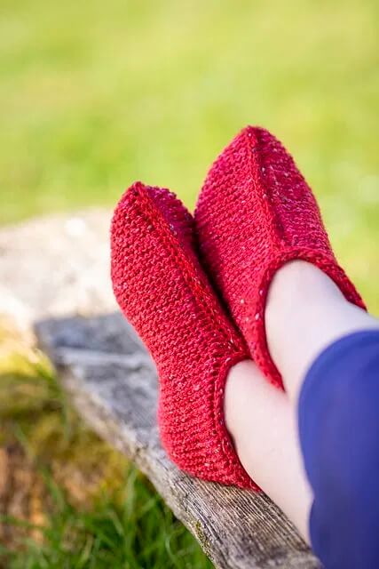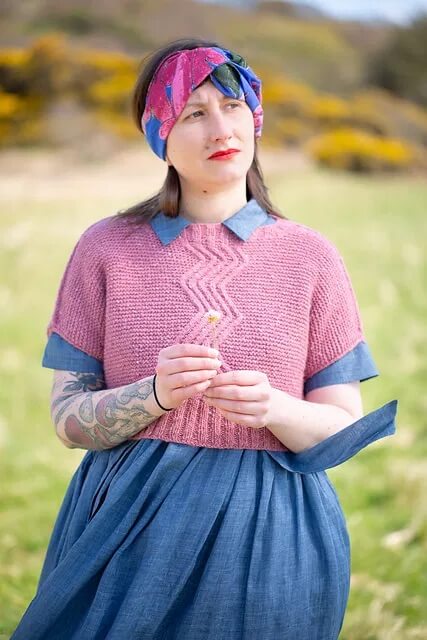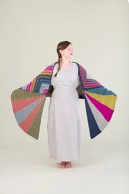 Kate Davies’ collection speaks to the detective author’s inventive spirit: a single, unbroken strand of yarn transforms itself into a three-dimensional slipper; hats and pullovers are knitted from side to side, while a triangular shawl up-ends itself to eventually become a cardigan.