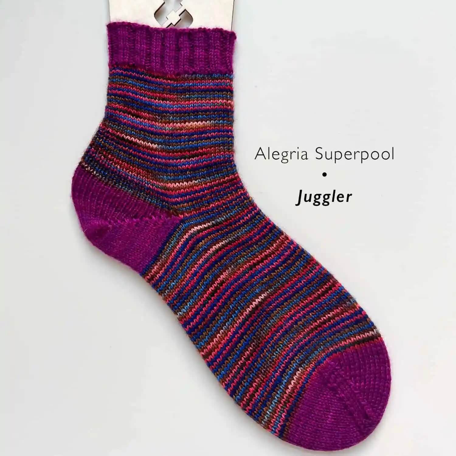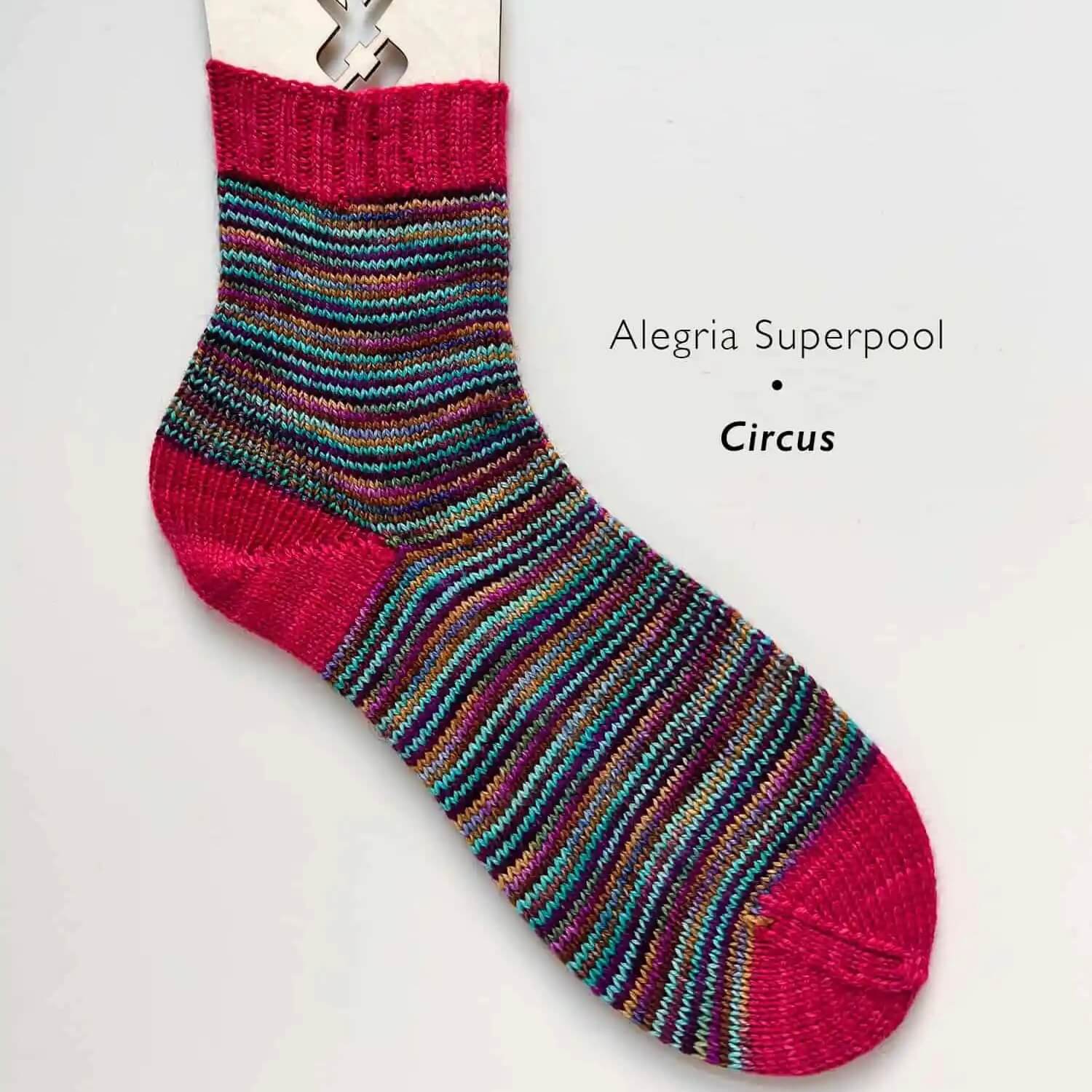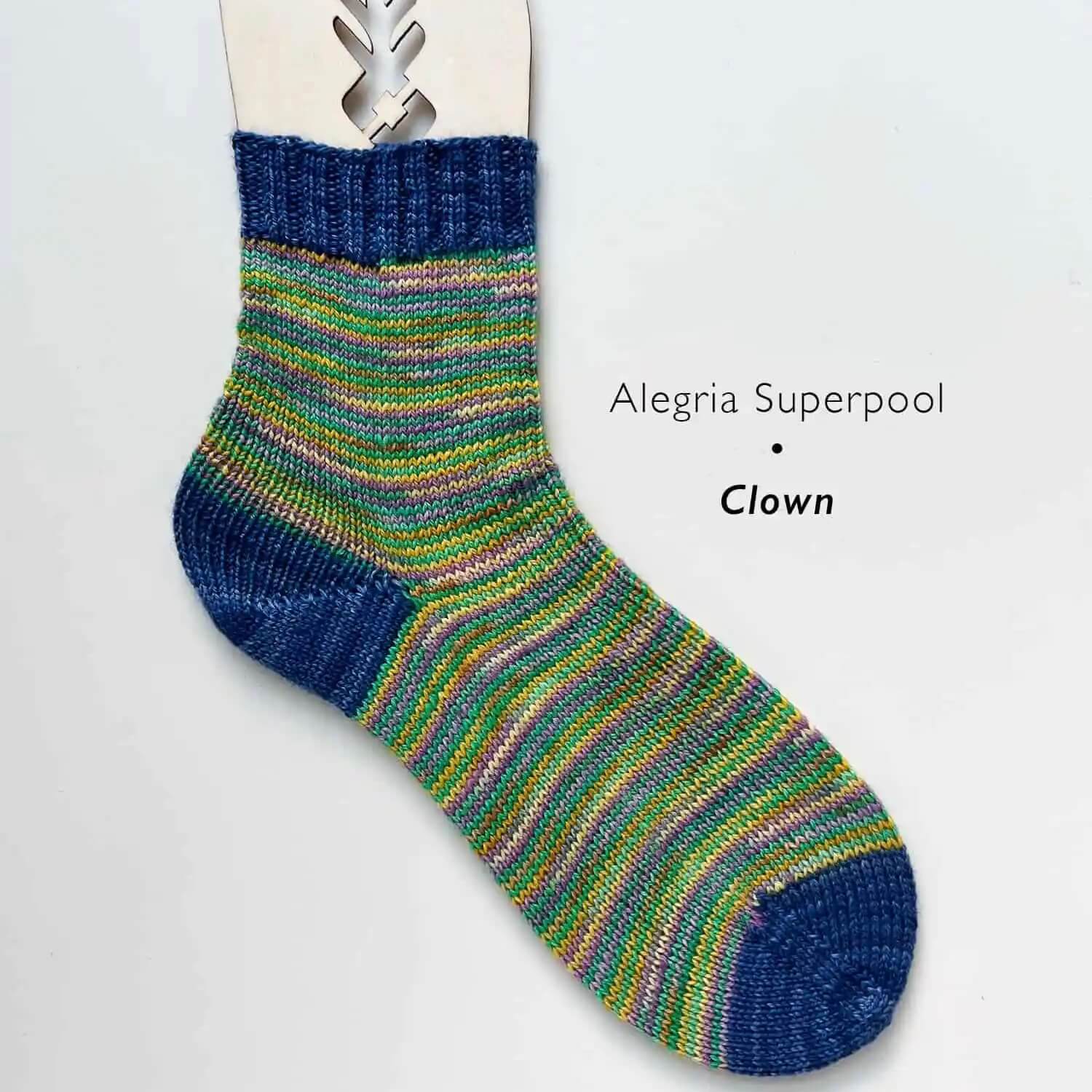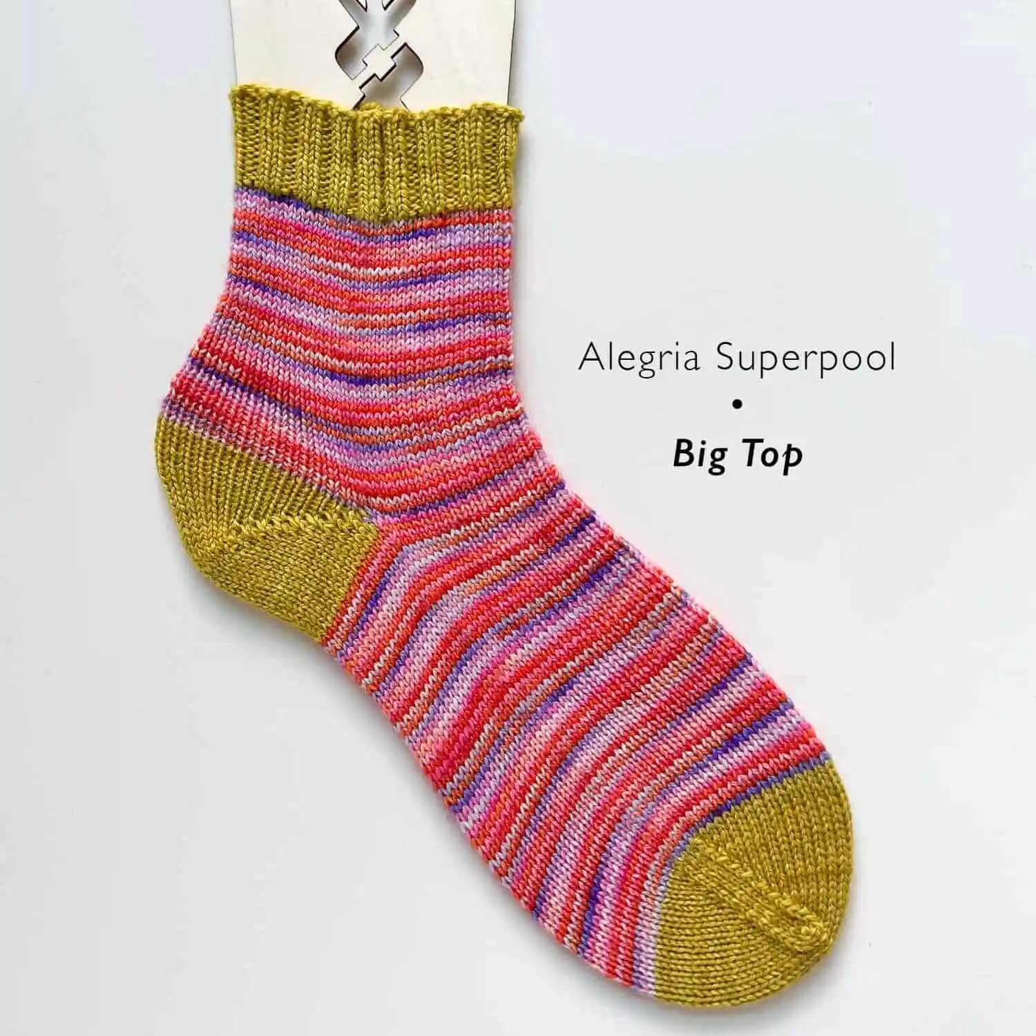 Each Alegria Superpool Set has 1 x 100g variegated skein of Alegria in circus-themed colours which are designed to stripe and pool, and a contrasting 20g solid/semi-solid mini skein. Great for contrasting cuffs, heels and toes or however you want to use it.