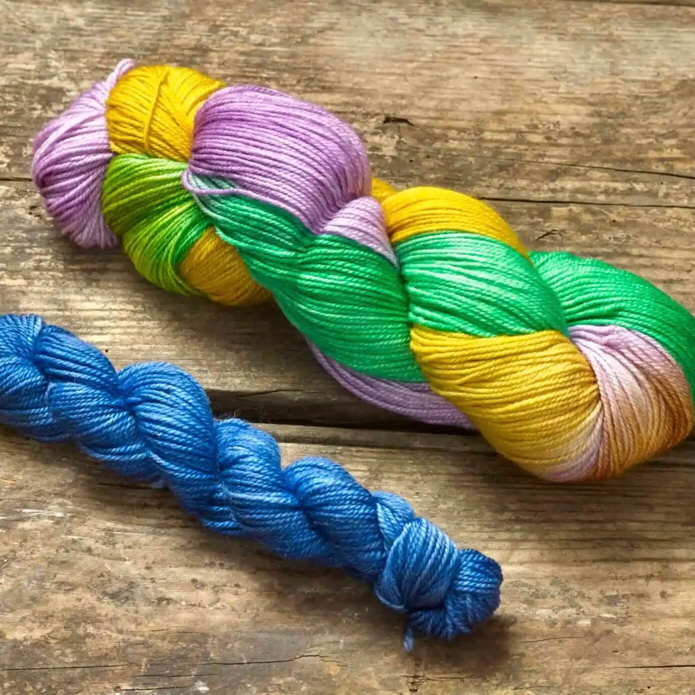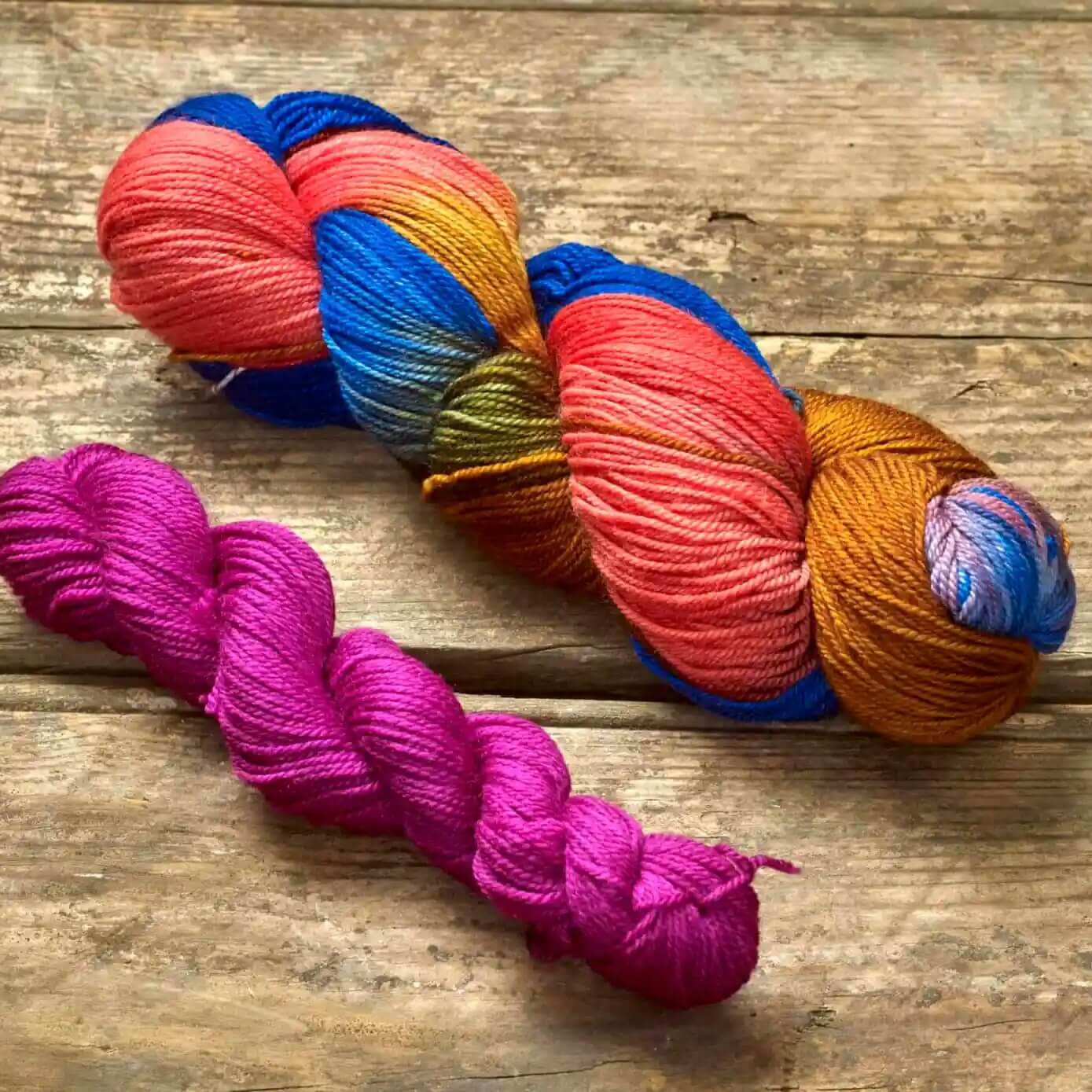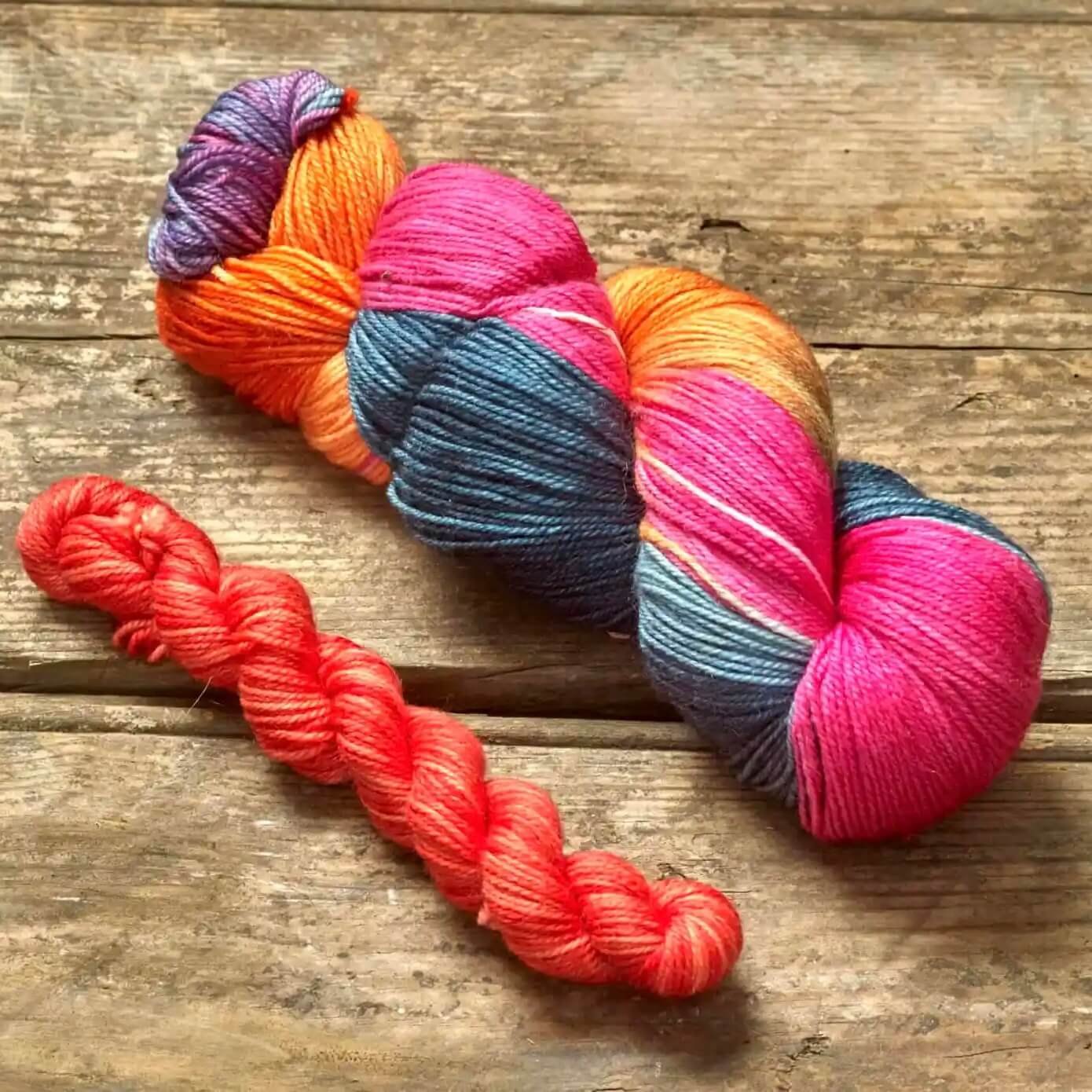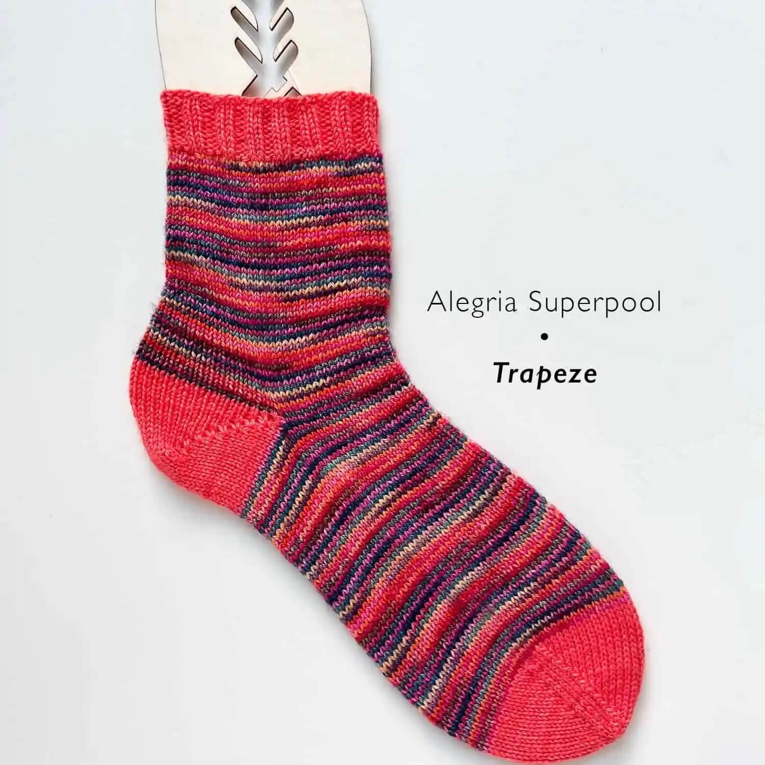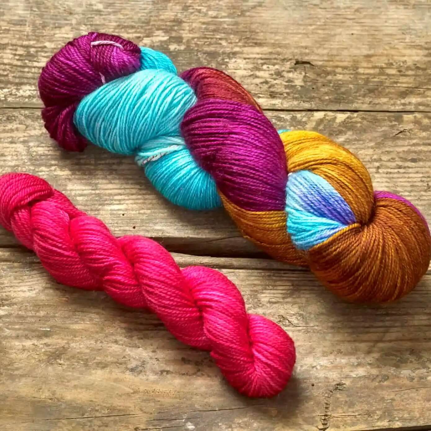 Each Alegria Superpool Set has 1 x 100g variegated skein of Alegria in circus-themed colours which are designed to stripe and pool, and a contrasting 20g solid/semi-solid mini skein. Great for contrasting cuffs, heels and toes or however you want to use it.