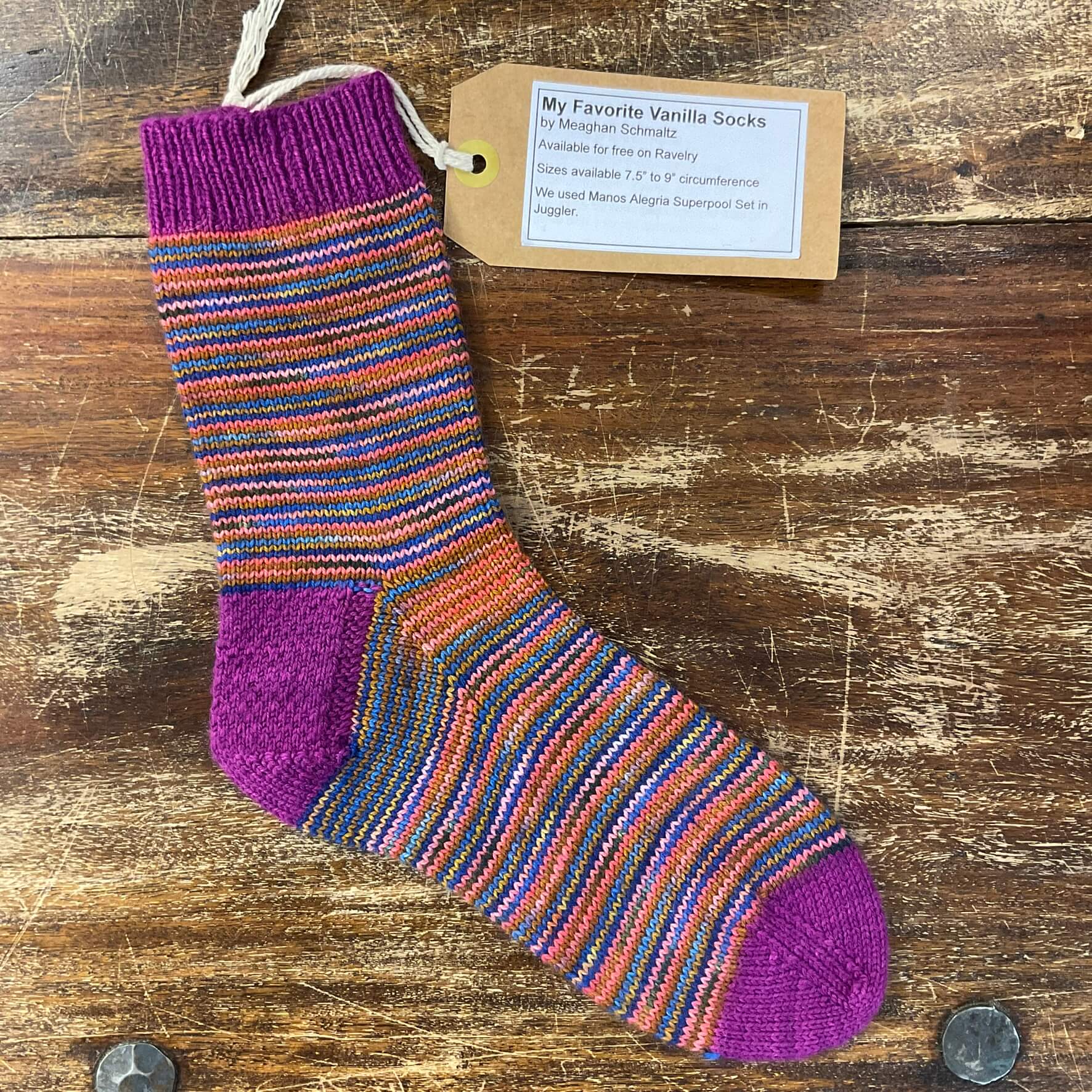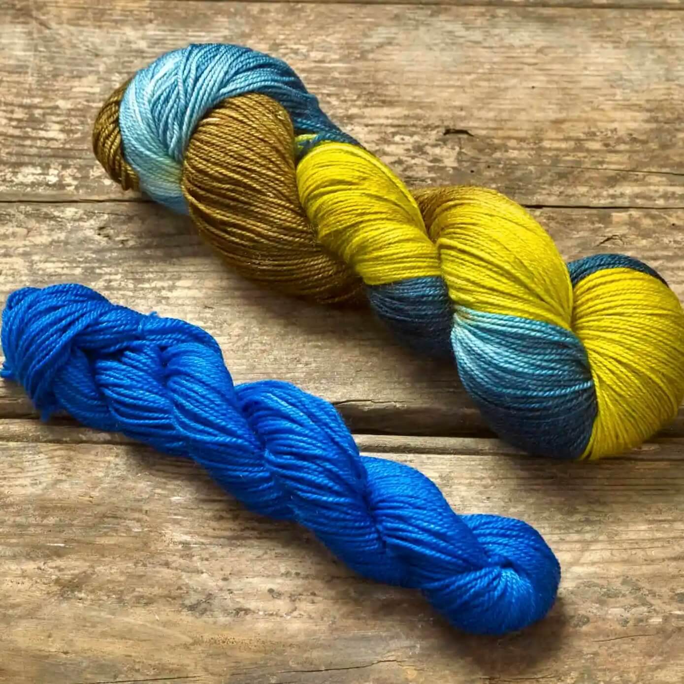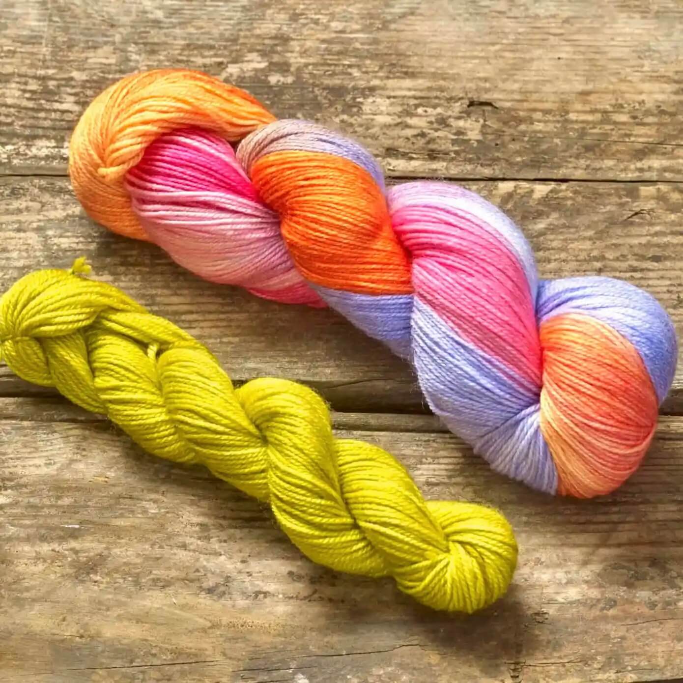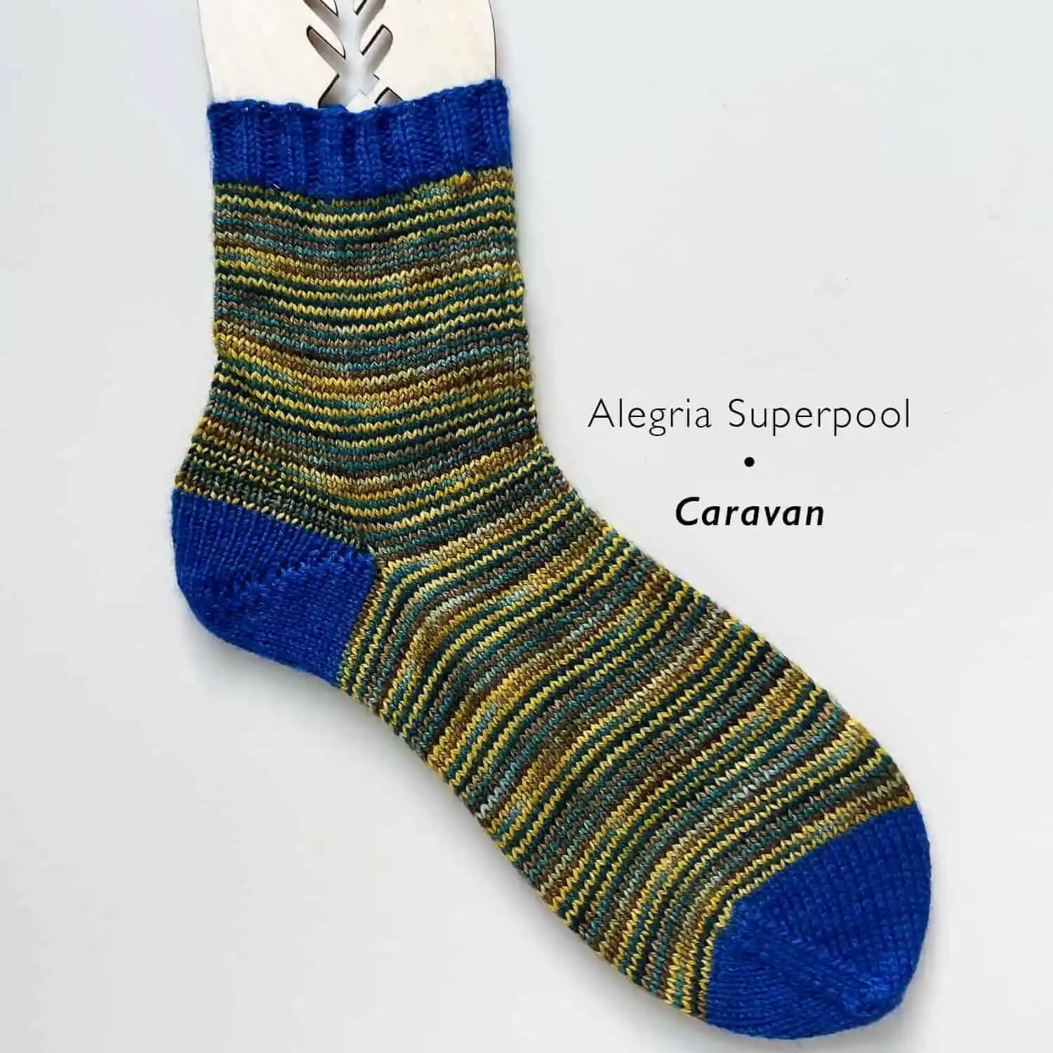 Each Alegria Superpool Set has 1 x 100g variegated skein of Alegria in circus-themed colours which are designed to stripe and pool, and a contrasting 20g solid/semi-solid mini skein. Great for contrasting cuffs, heels and toes or however you want to use it.