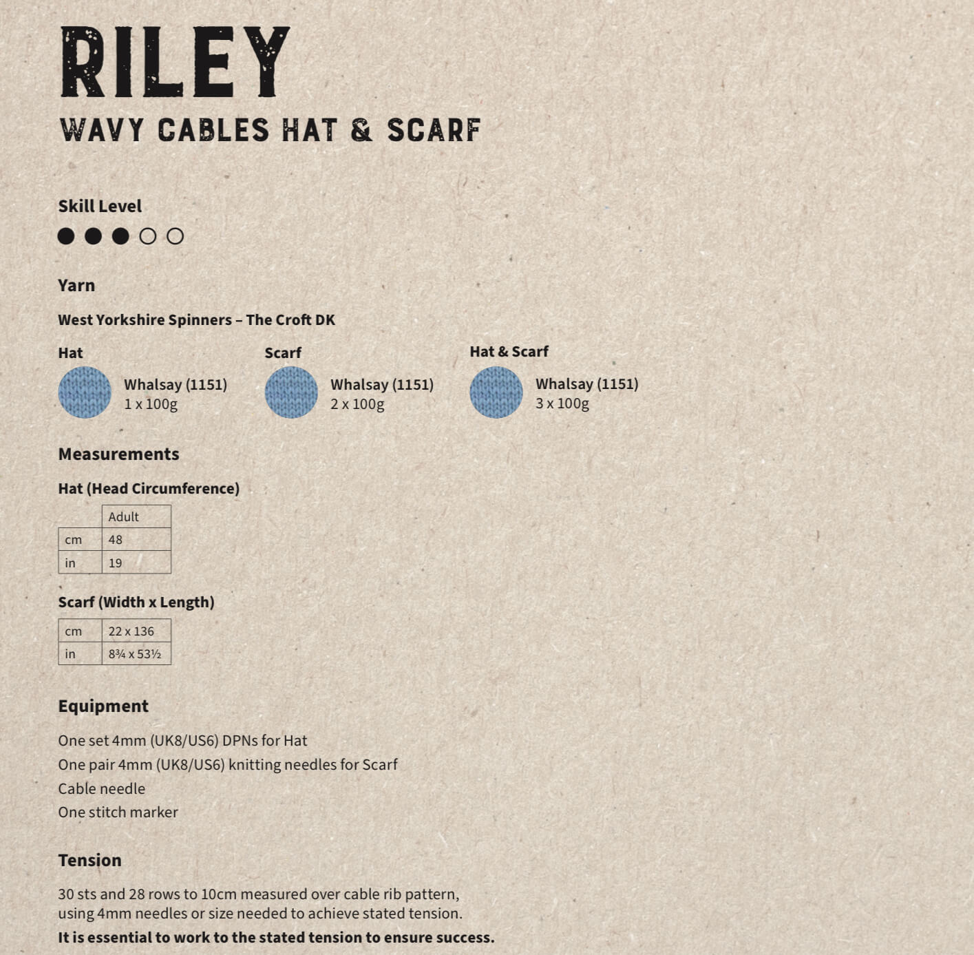 Free digital knitting pattern by Sarah Hatton, Riley is a scarf and hat set using a cable pattern to create a wavy stitch effect.