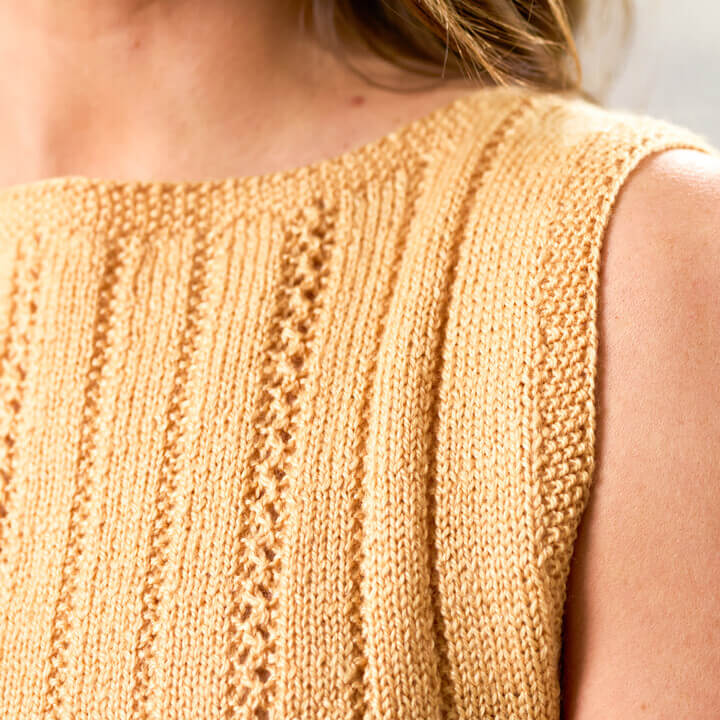 Free digital knitting pattern by Sarah Hatton, Vienna is a textured tank top.