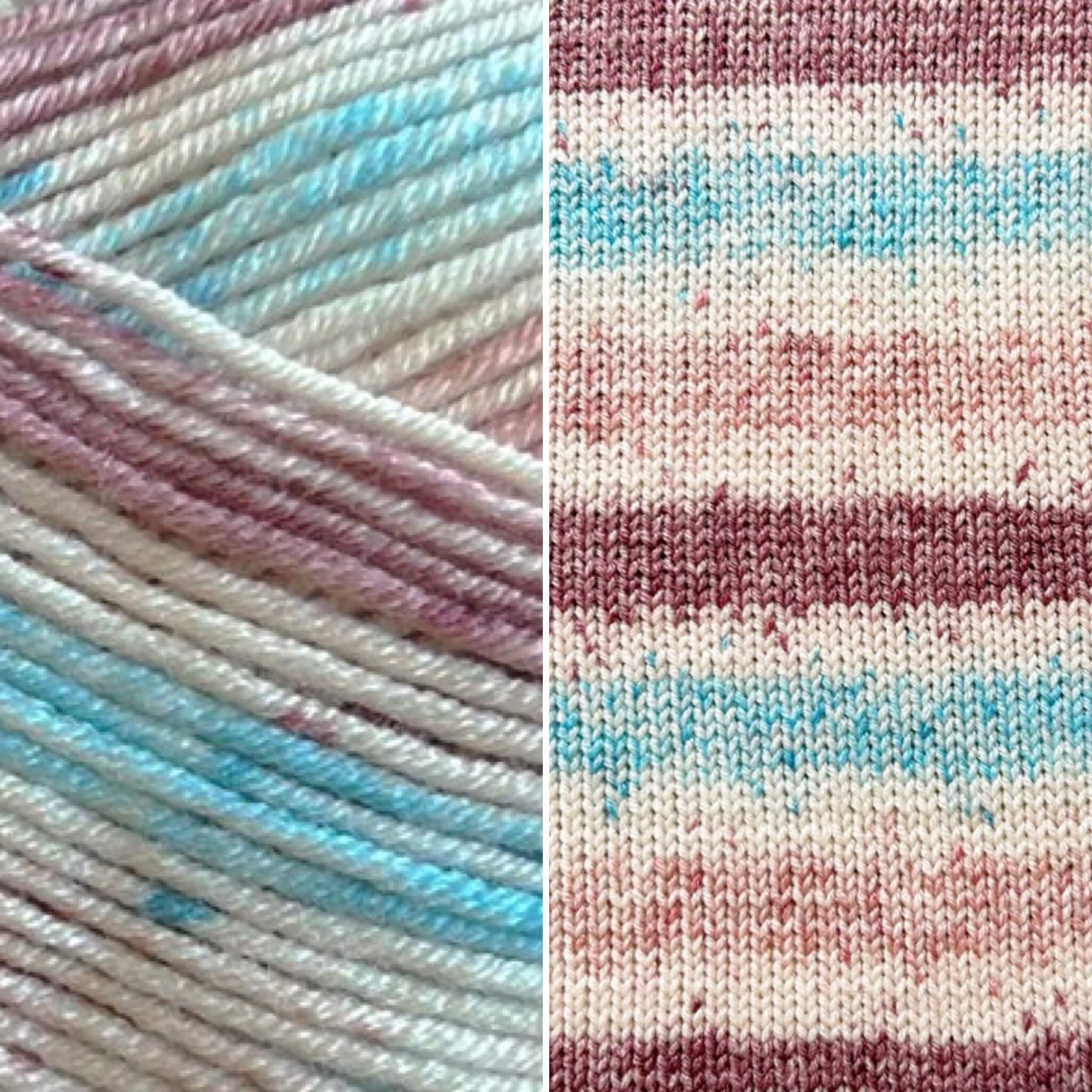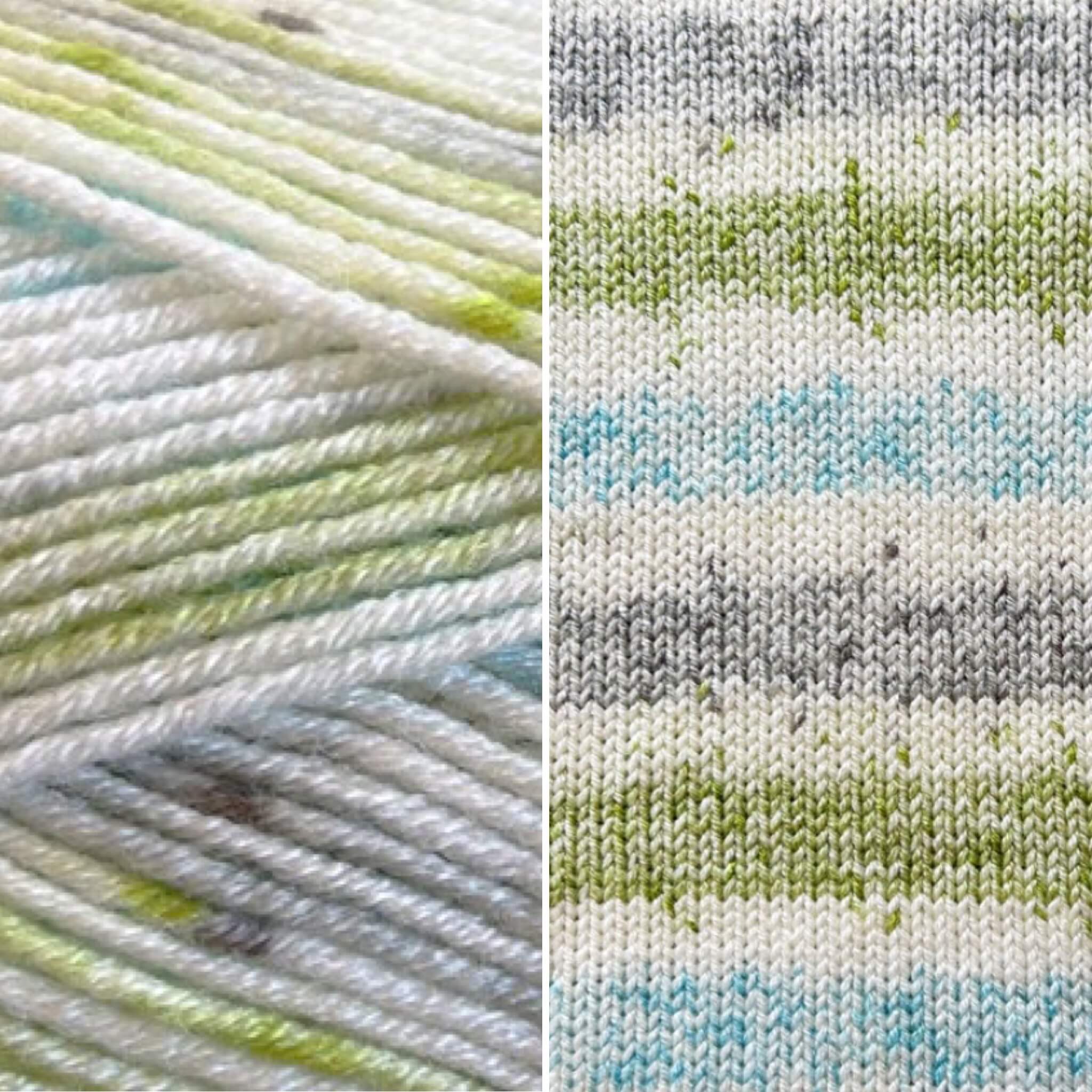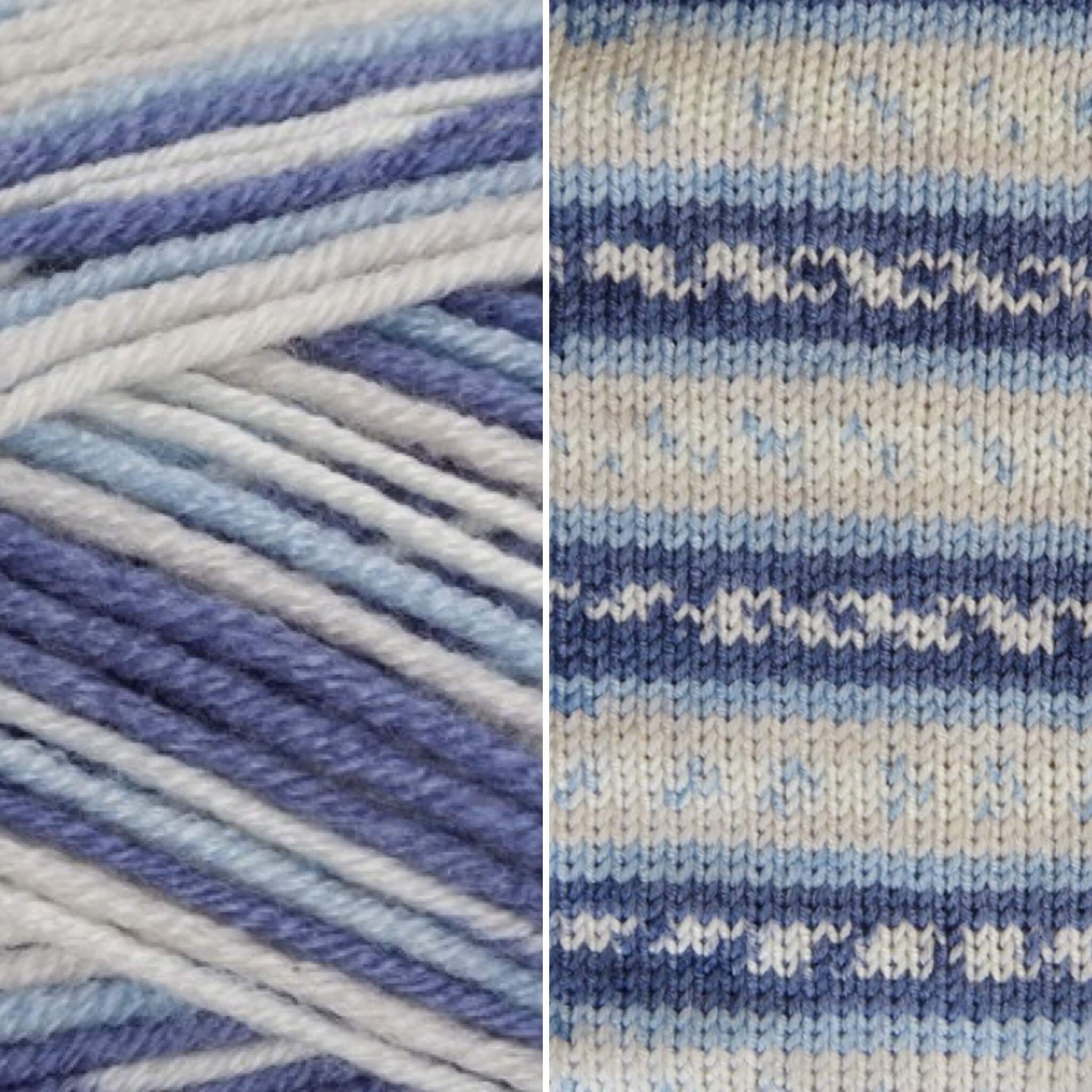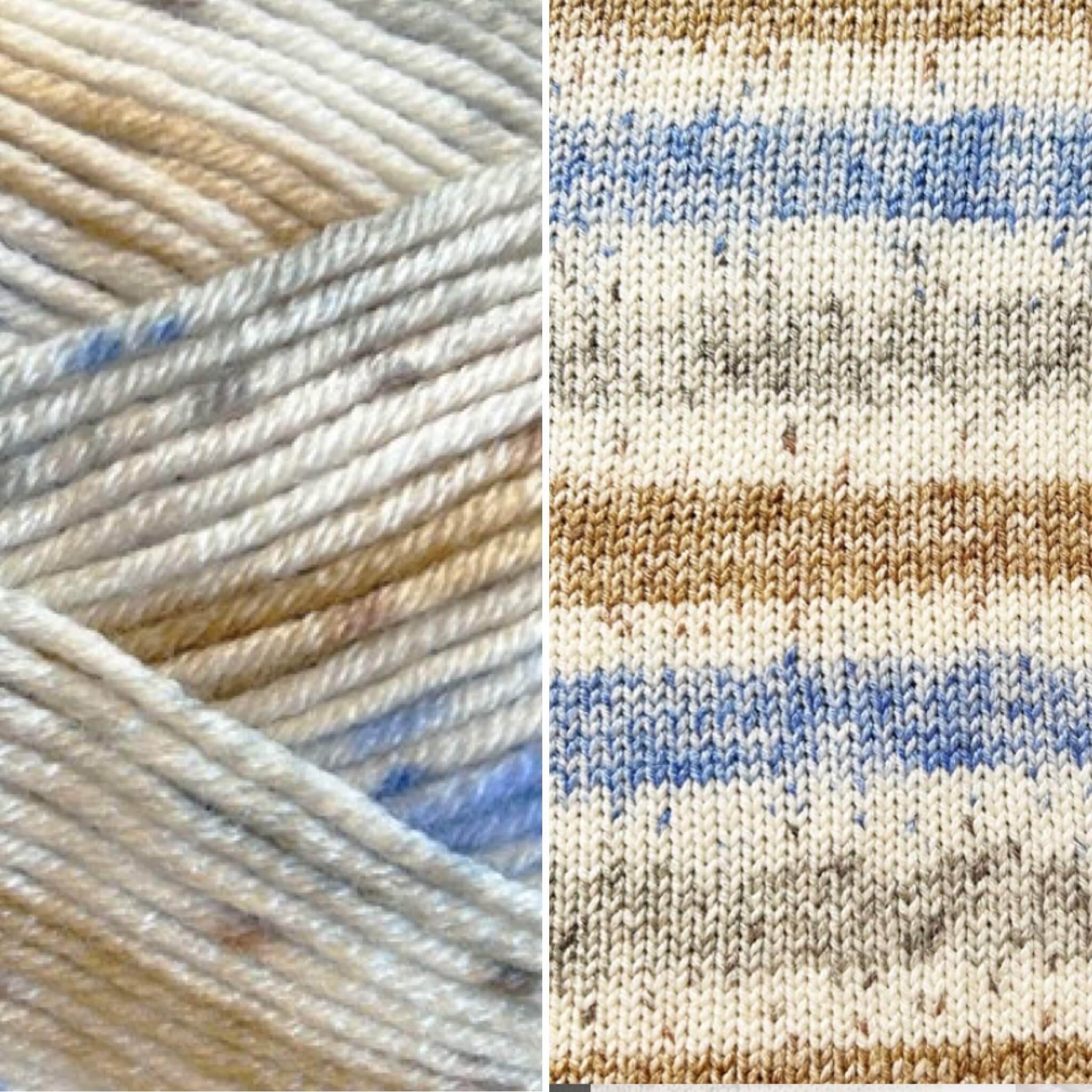 From Stylecraft, Bambino Prints is a self patterning DK yarn in a range of shades. Some have a striking fake fair isle effect others a more a speckled stripe.