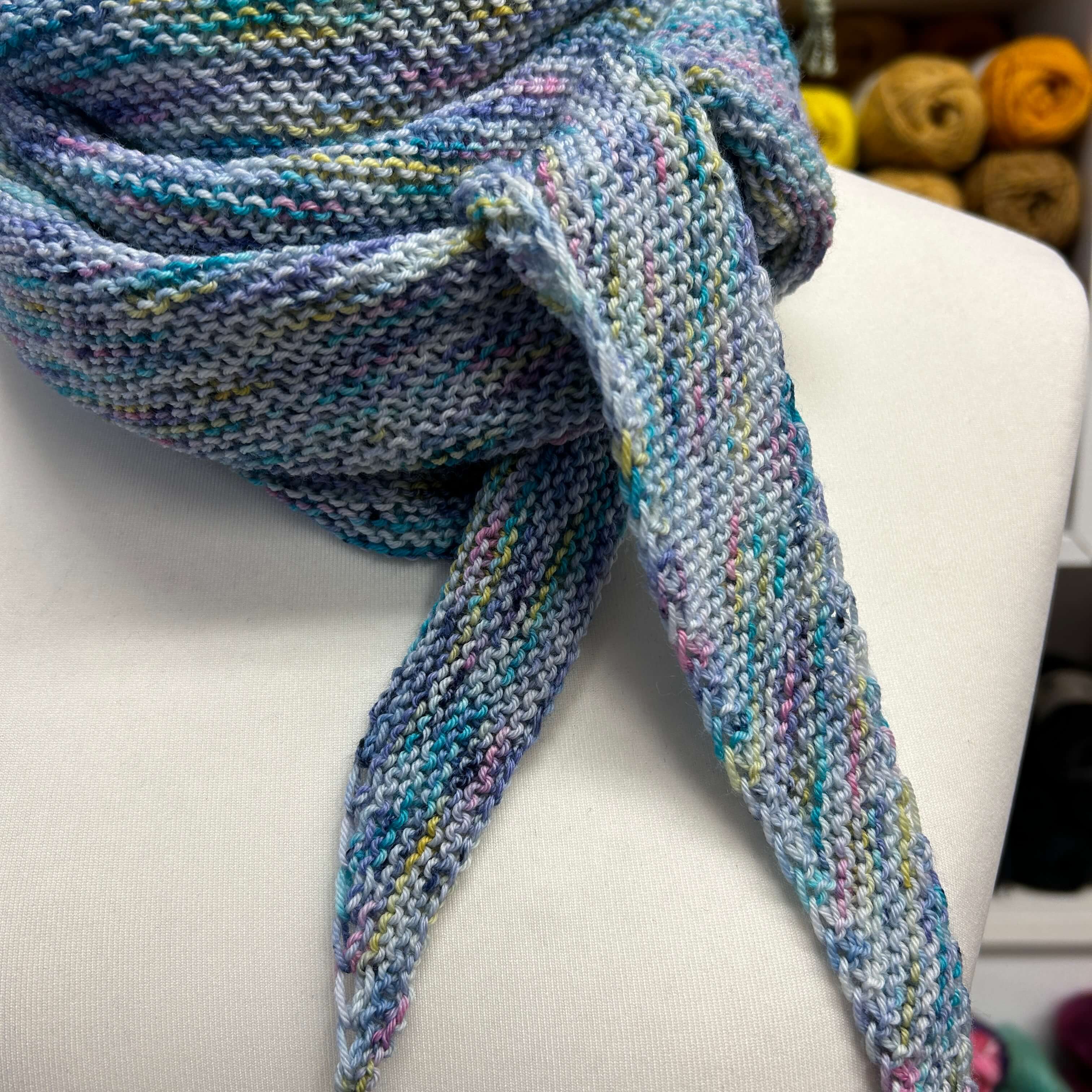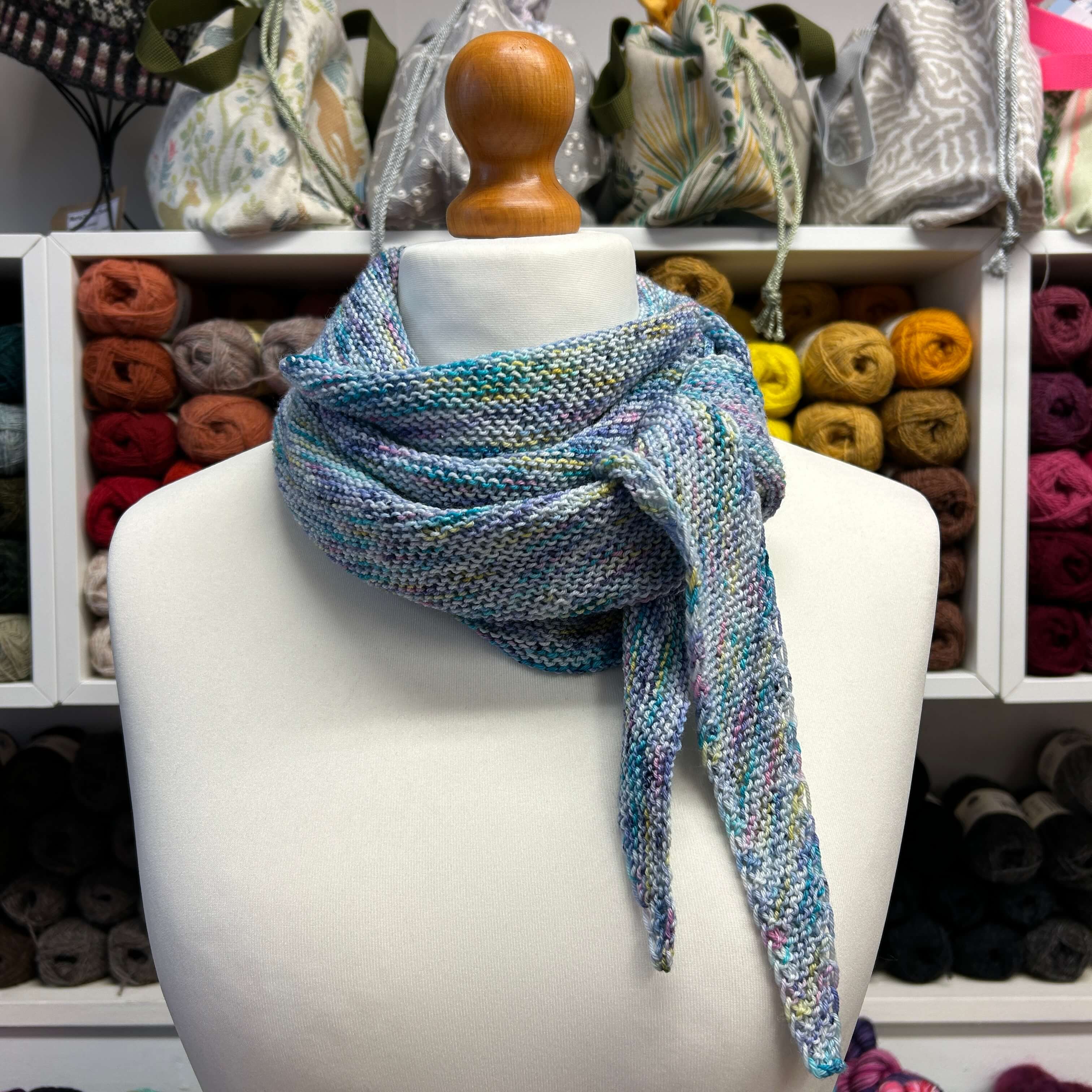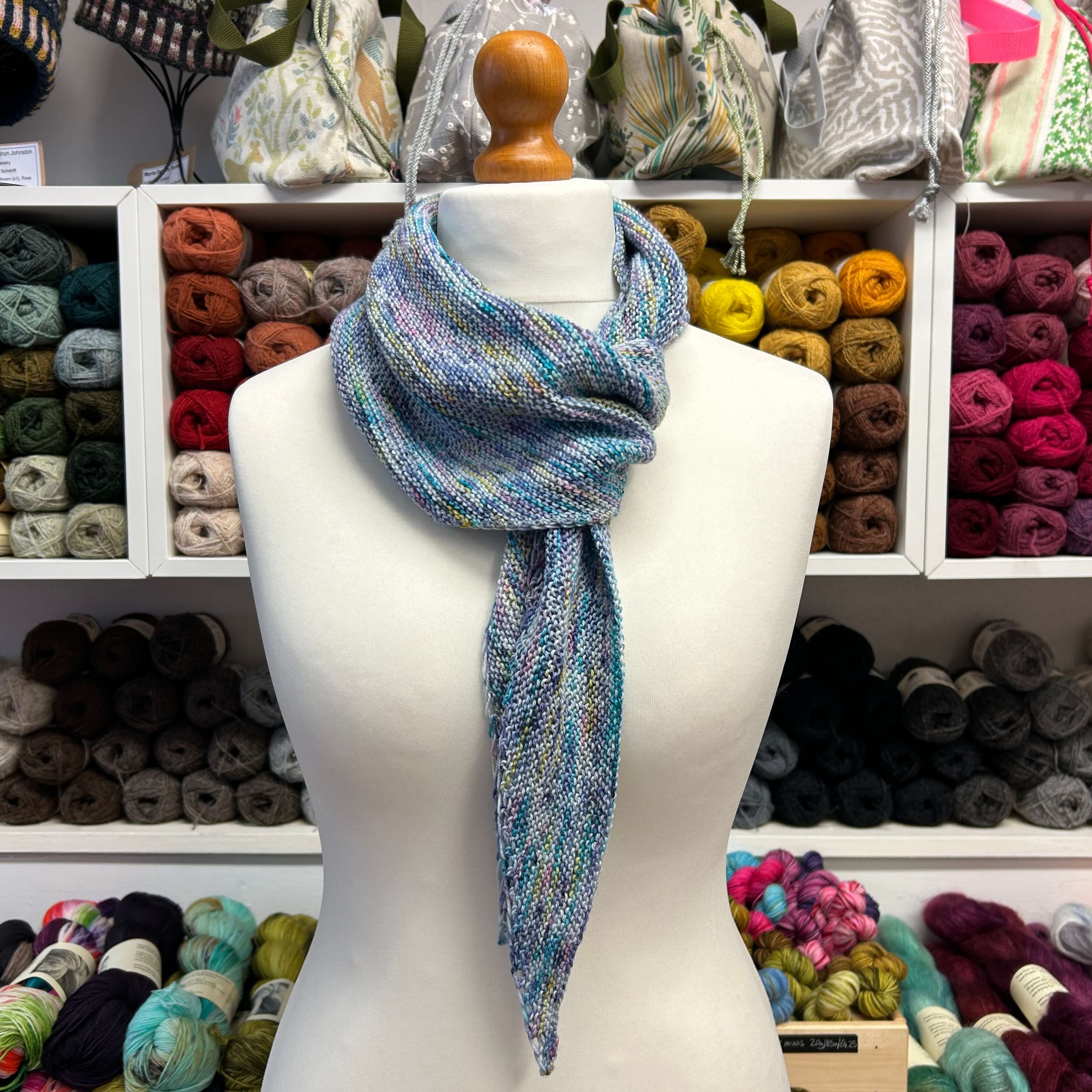 Free digital Woolly Brew knitting pattern for an asymmetrical scarf in 4ply yarn.