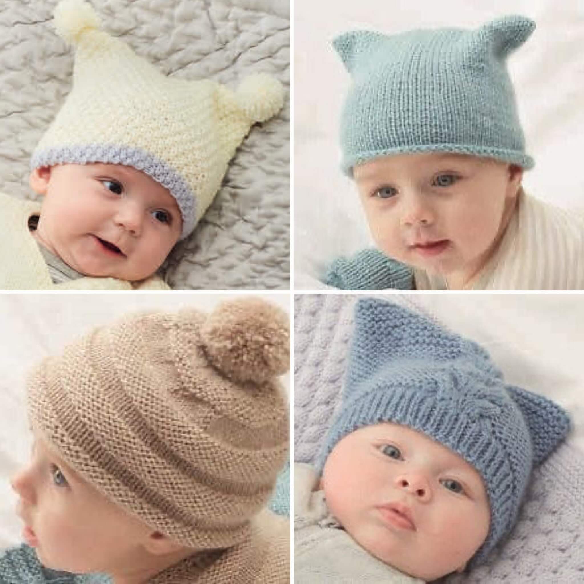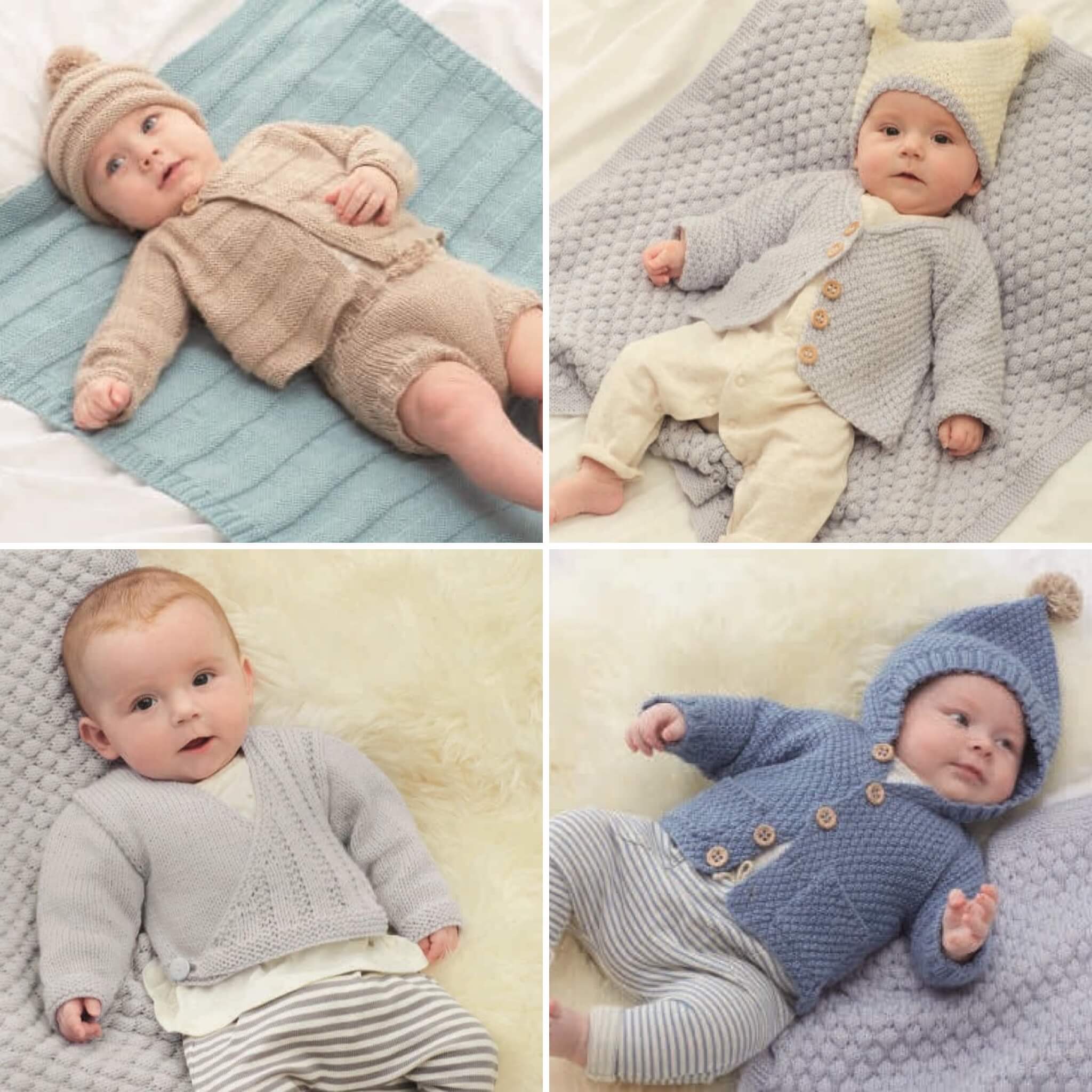 From King Cole a wide range of knitting patterns for babies - easy to wear cardigans, cosy hats, mitts and booties and two blankets.