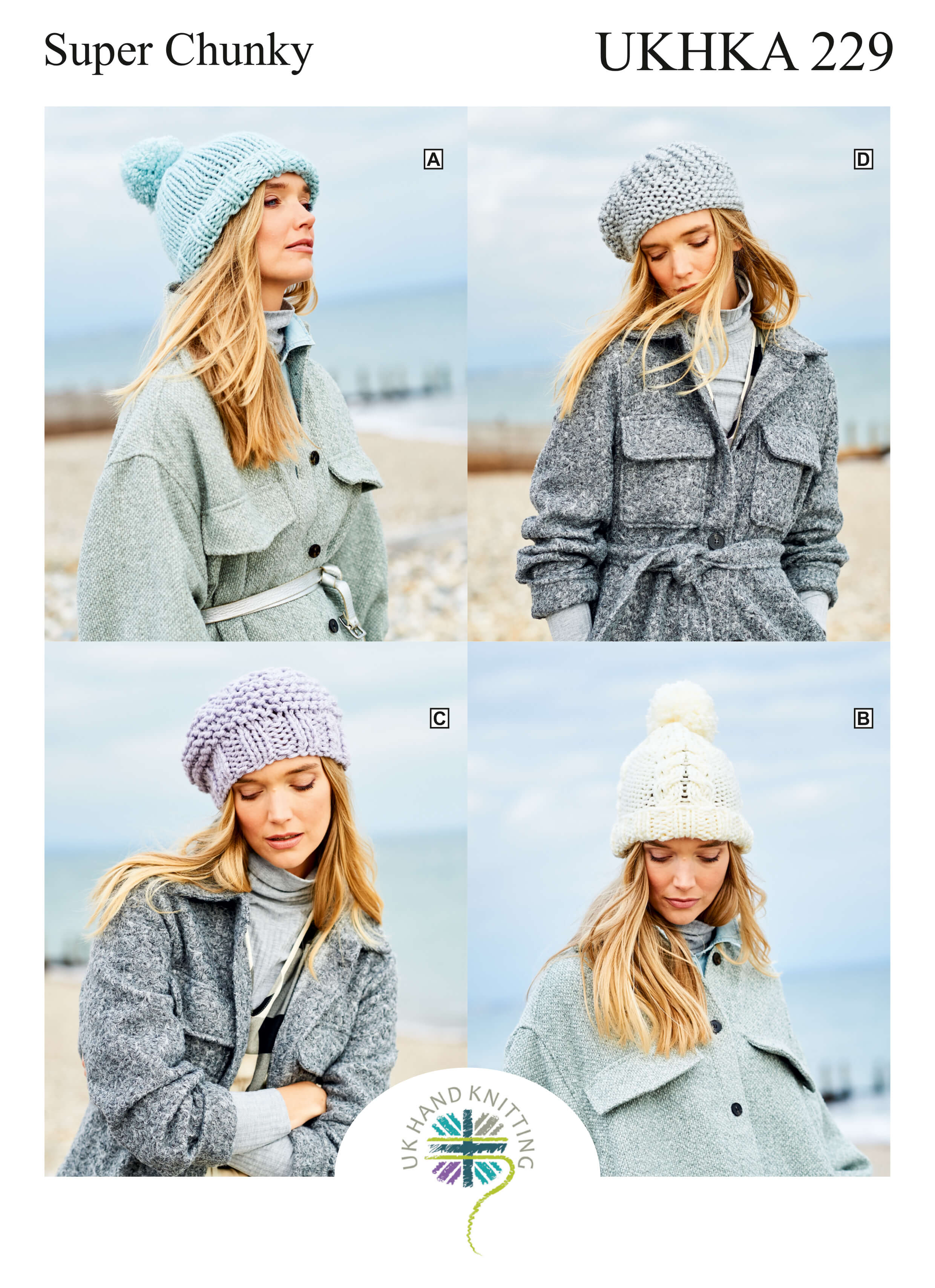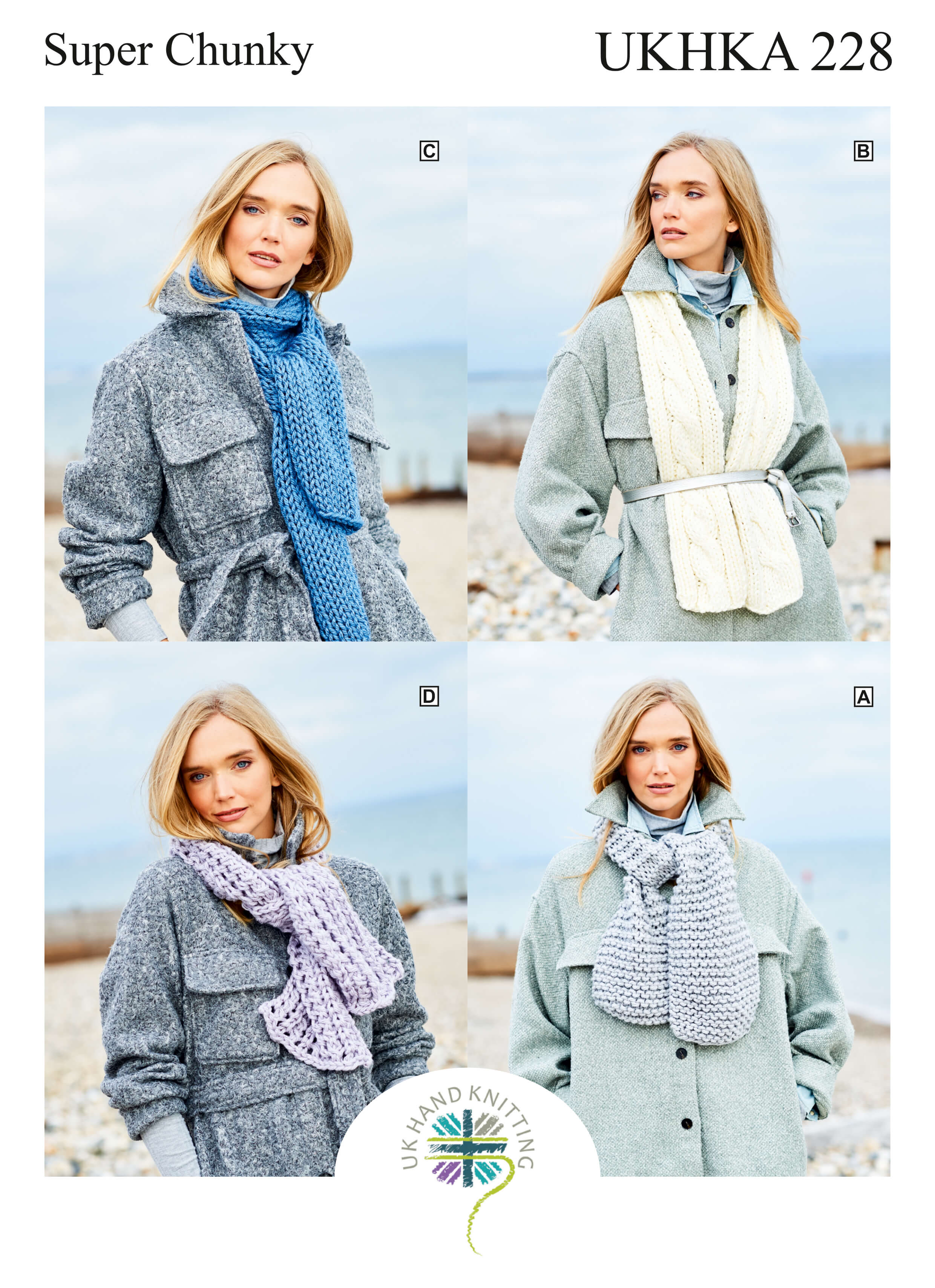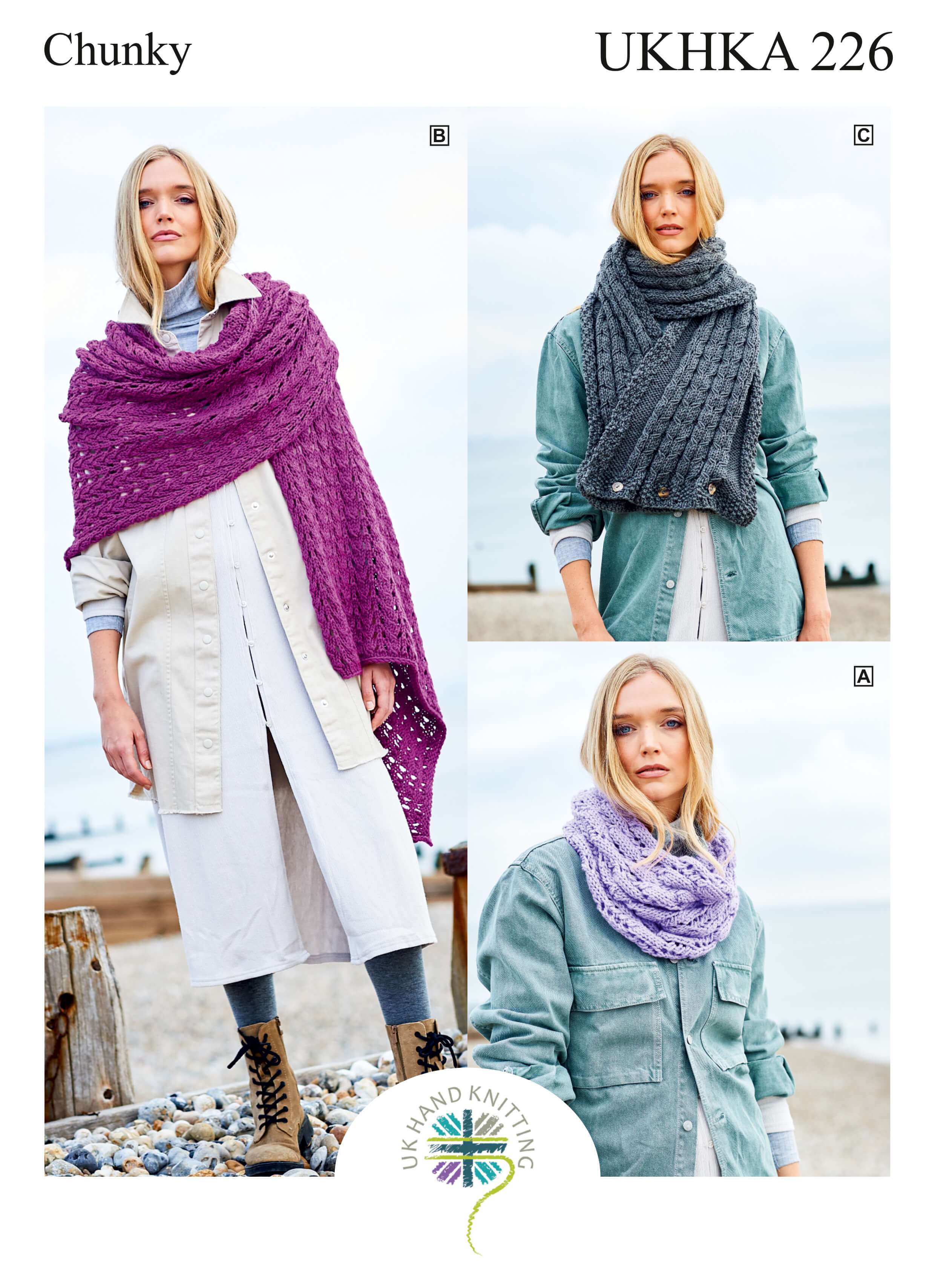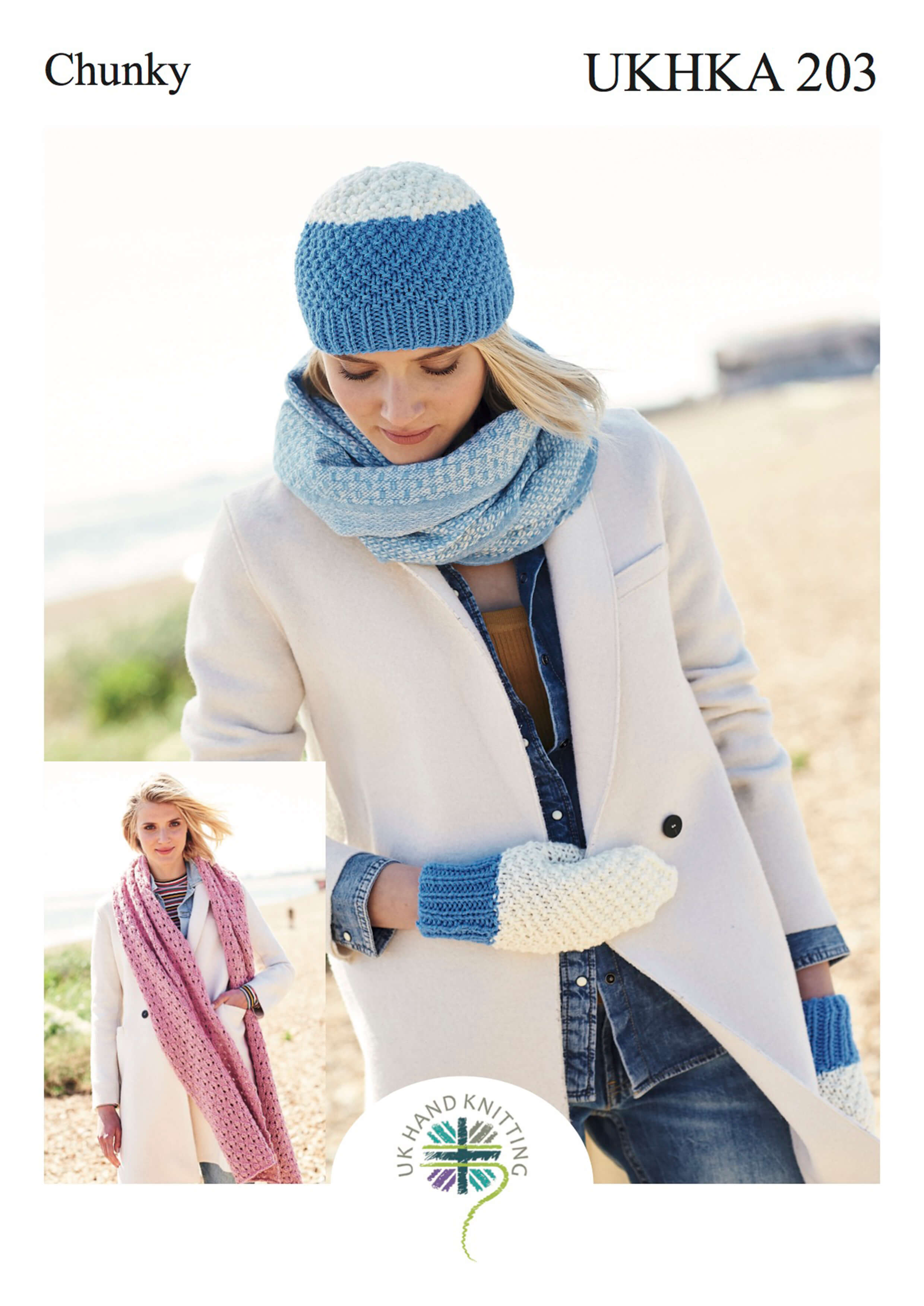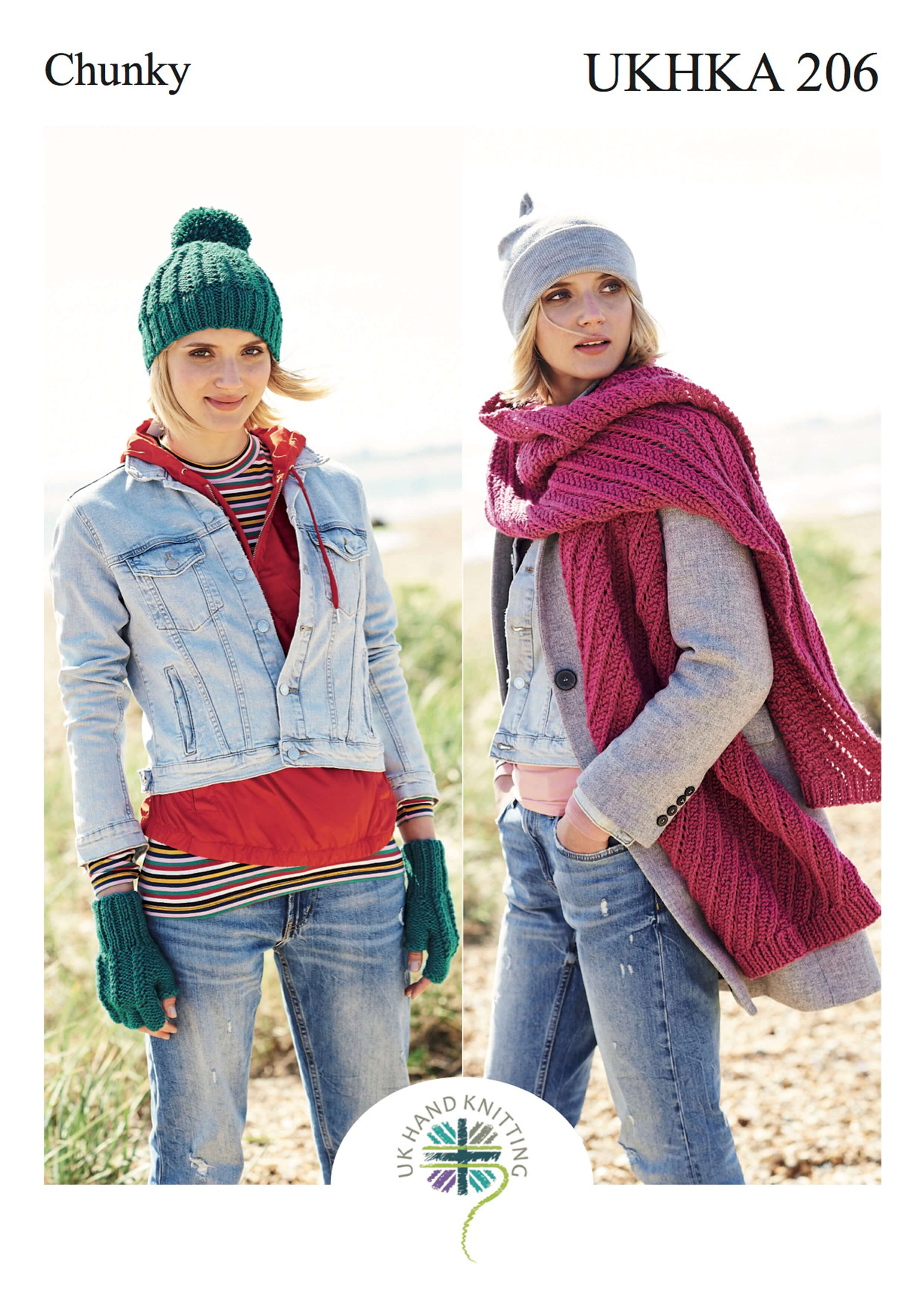 A selection of knitting patterns for hats, scarves, wraps and mitts from the UK Hand Knitting Association all using chunky and super chunky thick yarn.